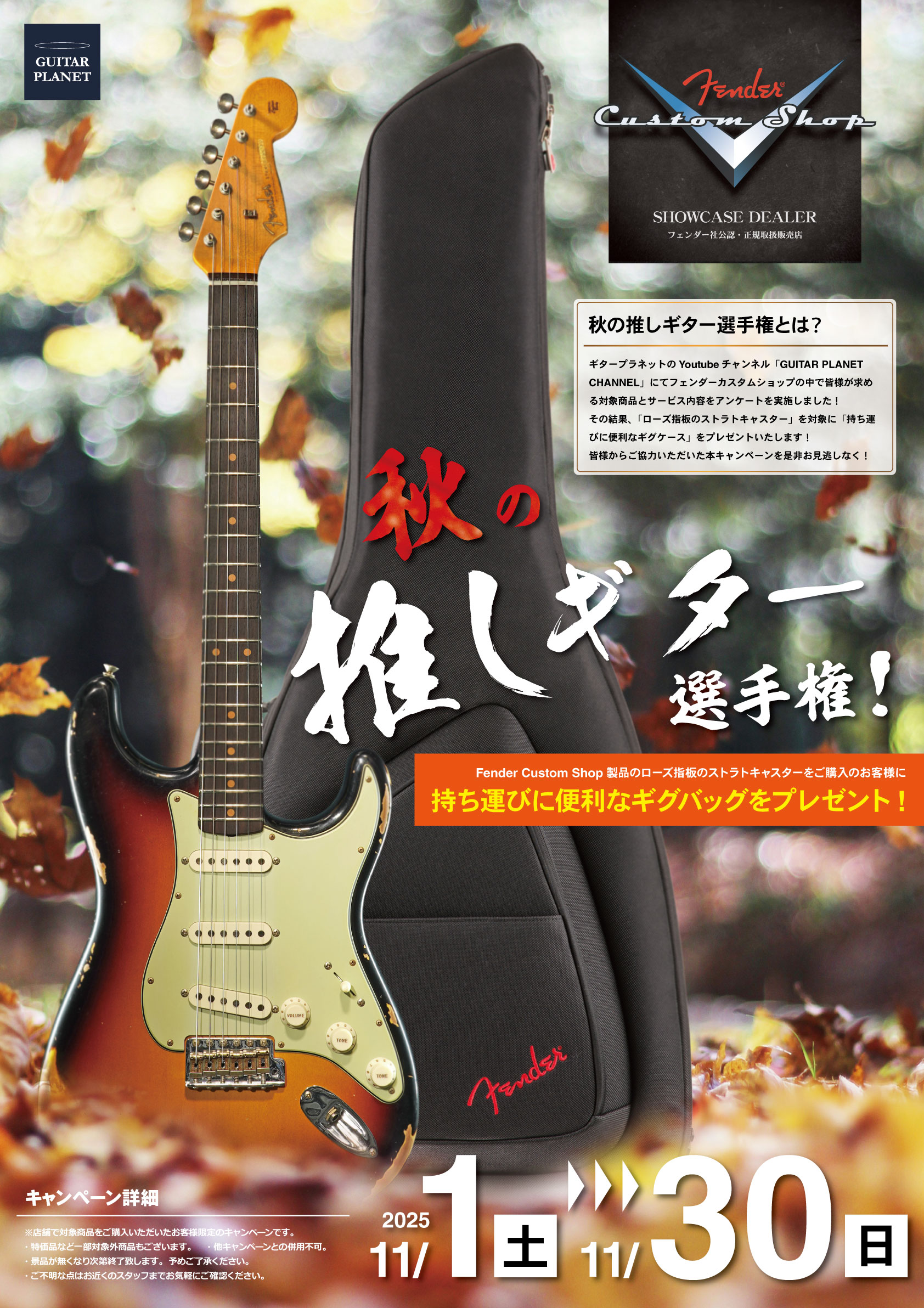 ギタープラネットのYoutubeチャンネル「GUITAR PLANET CHANNEL」にてフェンダーカスタムショップの中で皆様が求める対象商品とサービス内容をアンケートを実施しました! その結果、「ローズ指板のストラトキャスター」を対象に「持ち運びに便利なギグケース」をプレゼントいたします! 皆様からご協力いただいた本キャンペーンを是非お見逃しなく! |