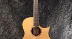 ボディトップにはシトカスプルースを単板で使用。ボディサイド&バック材は美しい杢目のマッカーサーエボニーを採用。見た目が美しいのはさることながら、重厚感と輪郭の弾きしまったリッチでソリッドなトーンを堪能できます。ソロギターにもぴったり馴染み易いサウンドではないでしょうか。また、ヘッド、指板インレイには彼の愛機にも採用されている"King Fisher"のデザインを採用。その名の通りKing Fisher(カワセミ)が川の魚を狩る姿が緻密に描かれています。サウンドホールラベルも川の中を連想させるオリジナルデザインとなっており、アートの世界にも精通するゆうさんならではの作品になっております。