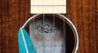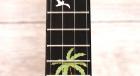 フィンガーボードにデザインされたサンセットビーチ、サウンドホール周りにはサーフボードのインレイが施されています。