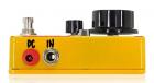 ・Sensitivity:小さい方のノブです。このノブは僅かな応答から自己発振まで広く音を調整します。接続する機材やセッティングによっても結果が異なります。Sensitivityを低く設定すると、機材などによっては偶発的にサブオクターブが加わることもあります。ノブを高くしていくと動作が安定していきます。このときギターのToneノブでファズの滑らかさを調整することもできます。さらにSensitivityを上げていくと不安定になり、グリッチやアーティファクトが発生します。最大付近ではCMOSがフロアノイズの痕跡を拾って波形に変換しようとするため、自己発振によるカオスな音色となる場合があります。これもフロアノイズのレベルなどによって異なるため、様々な環境、状況により異なる応答を示すことがあります。