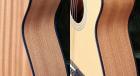 サテンフィニッシュのボディとネック、ホワイトプラスチックのサウンドホールリング、パールボタンのペグなどシンプルで品の良いルックスです。