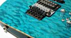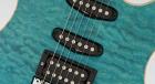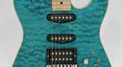 キルトの杢目が映える一番人気のボラボラブルーの淡いお色味とロック式トレモロえを搭載したハードなルックスが印象的な個体です。
