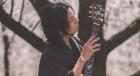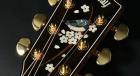 メジロが留まる満開の桜花を描いたヘッドから、花びらが木の幹に見立てた指板上へ「零れ落ちていく」情景を、白蝶貝やアバロン、木材などの素材を惜しみなく用いて表現しました。