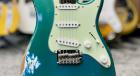 The faded finish, with the check pattern and the underlying white and blue colors peeking through, is well done, and the headstock, which has developed a nice amber hue, also gives a sense of quality.