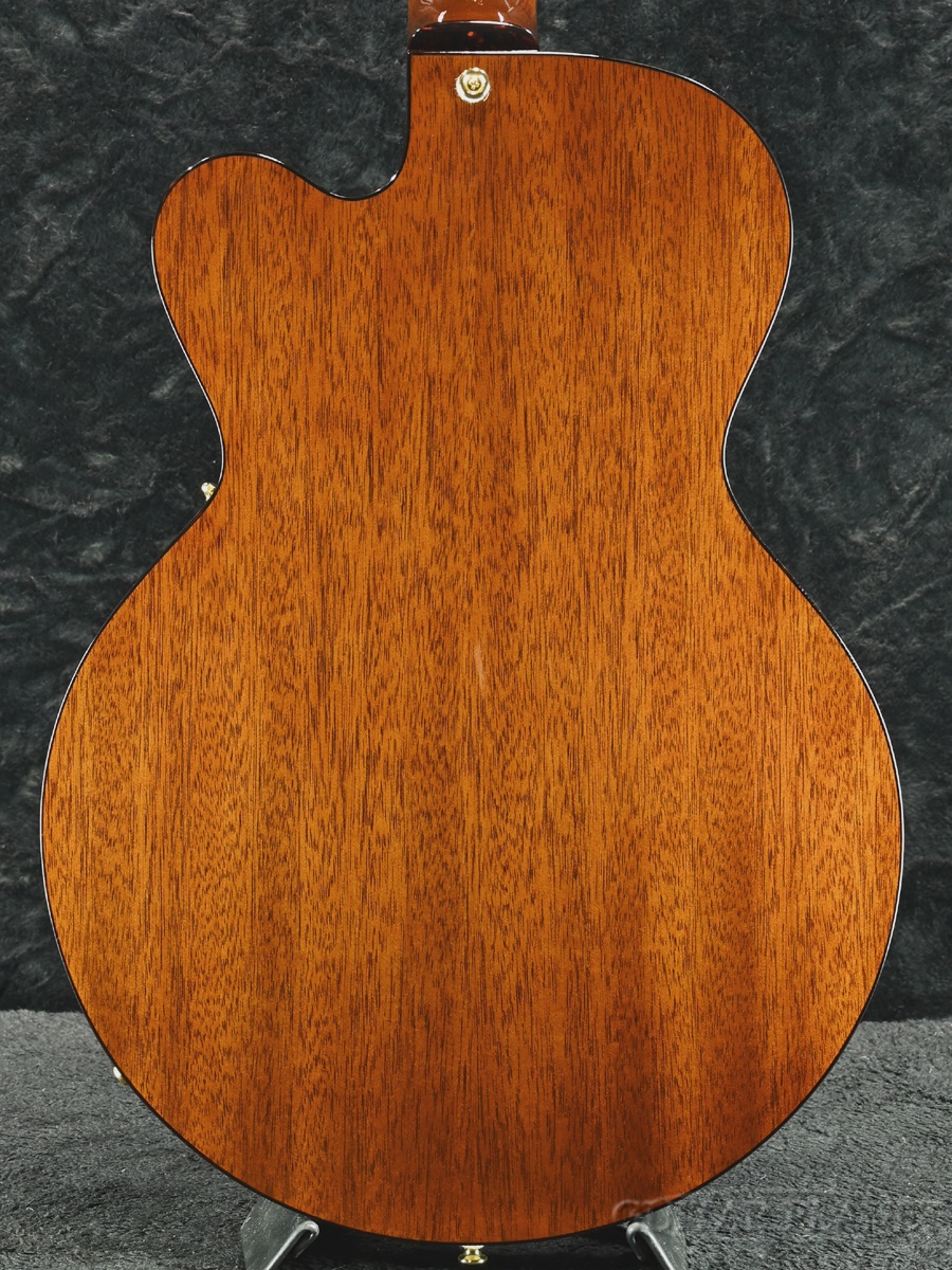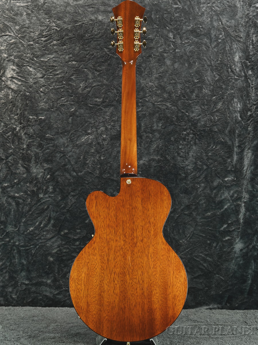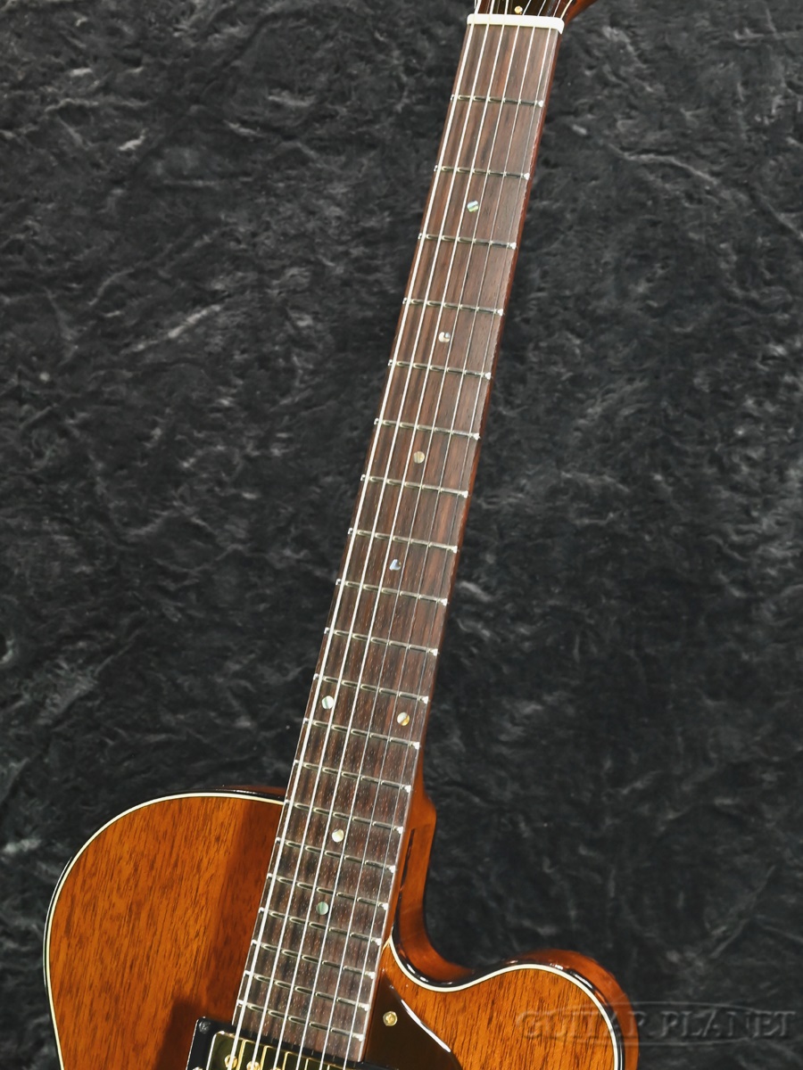 この度お預かり致しましたモデルは、小振りなボディで取り回しの良いフルアコースティックギターで、13.85インチ幅、約44ミリの薄胴を採用したラミネイト・マホガニーボディに、ローズウッド指板を貼り合わせたマホガニーネックがセットネック構造にてジョイントされております。