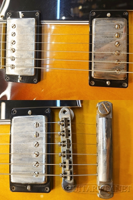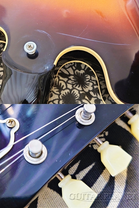 過去にピックガードを取り外して使用された形跡が確認出来、ピックガードの下にスクラッチ傷が確認することが出来ます。