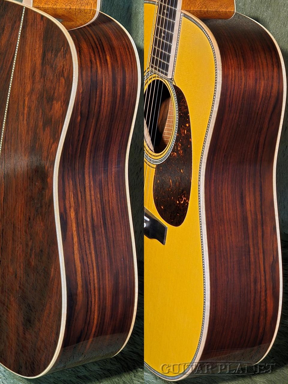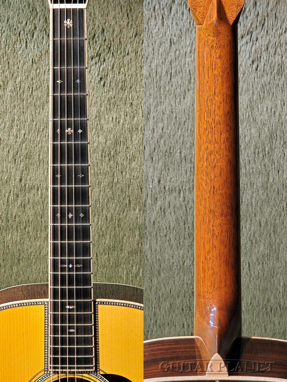 プレミアムグレードのアディロンダックスプルースとココボロをボディの組み合わせに、アディロンダック・スプルースを使用したスキャロップド・ブレーシング、ジュニュイン・マホガニーネックに、Style 45のスノーフレーク・インレイが散りばめられたエボニー指板、ヨーロピアン・メイプルバインディングに、アコヤ貝のヘリンボーントリムが強烈なアクセントになっています。