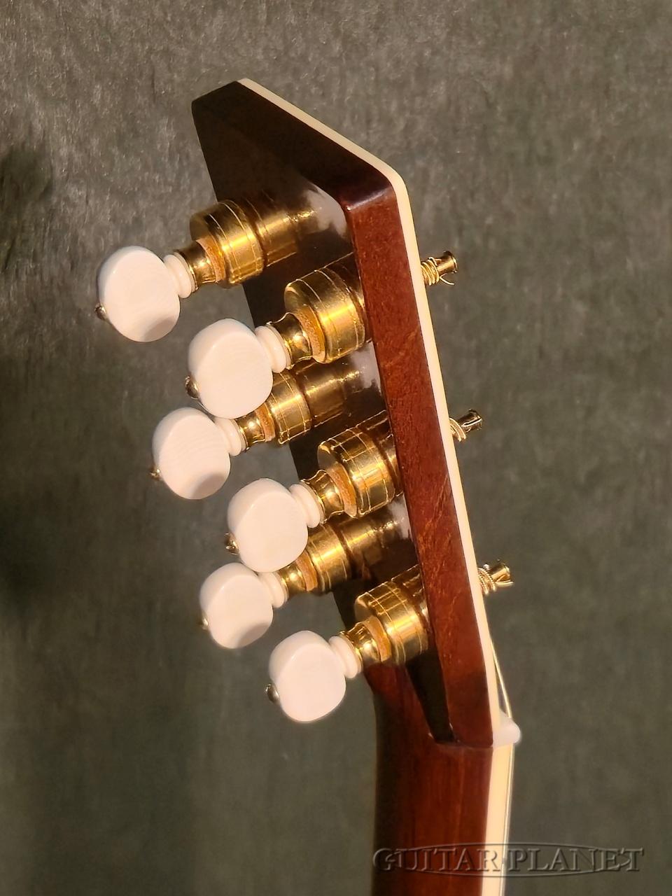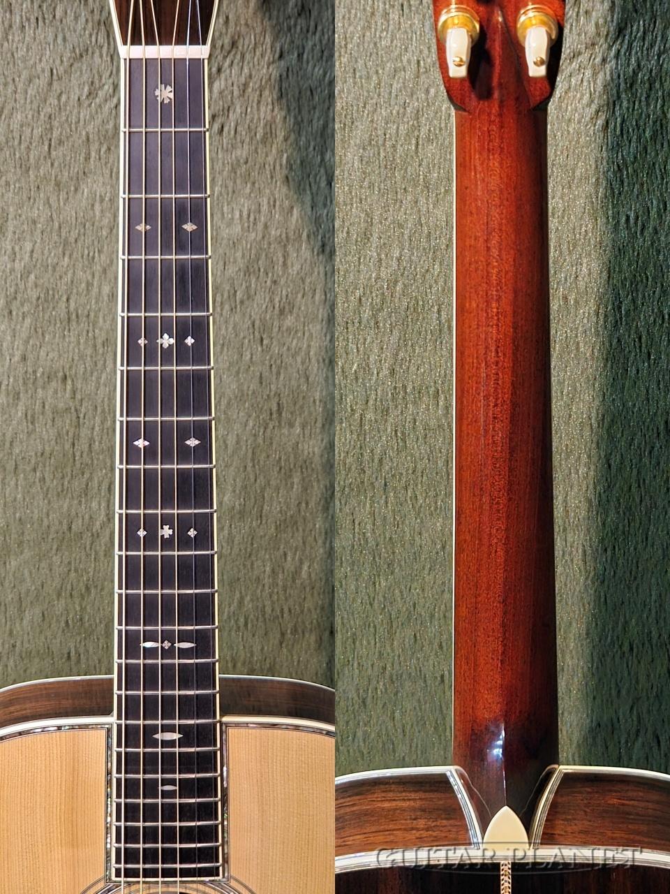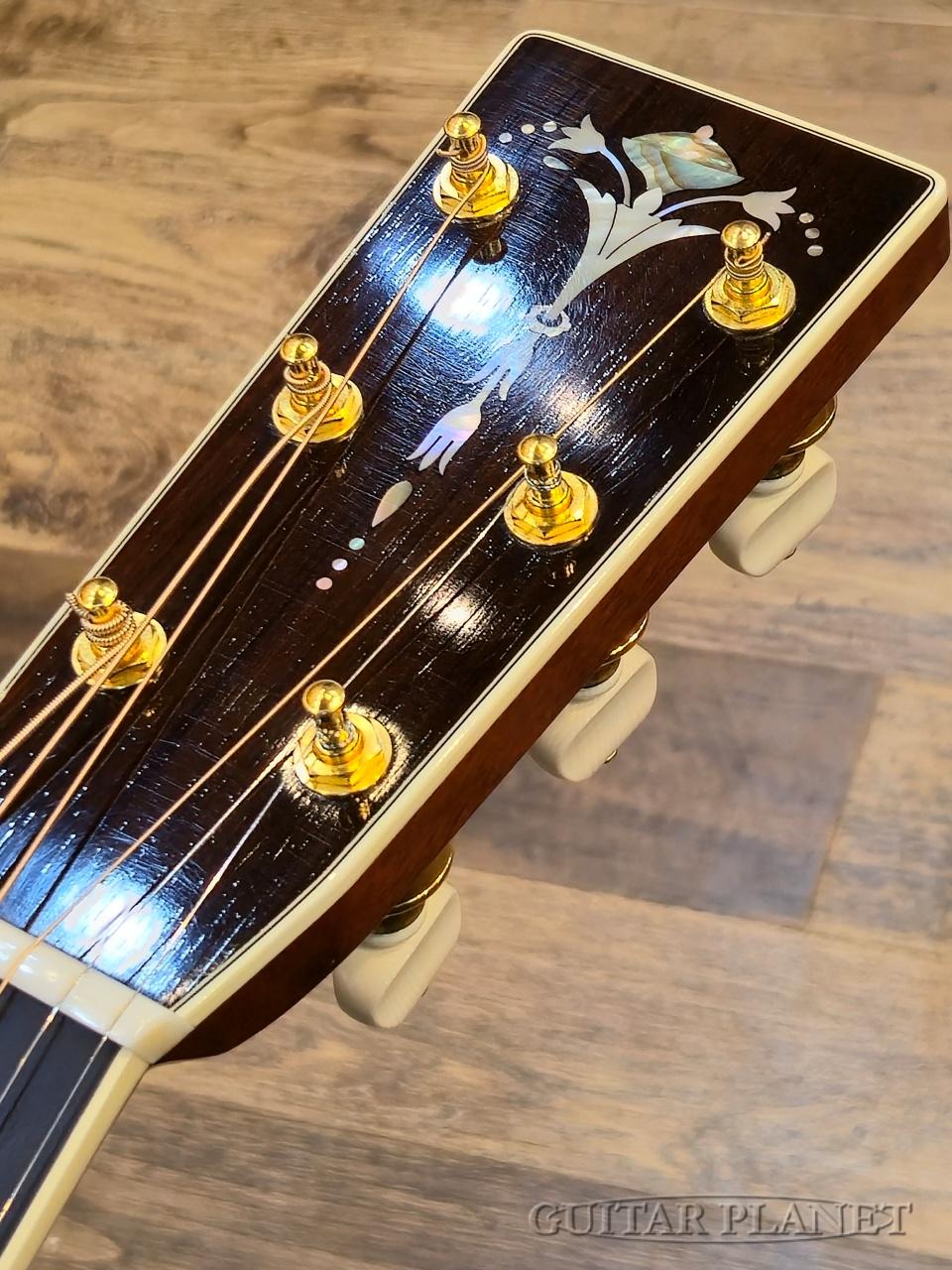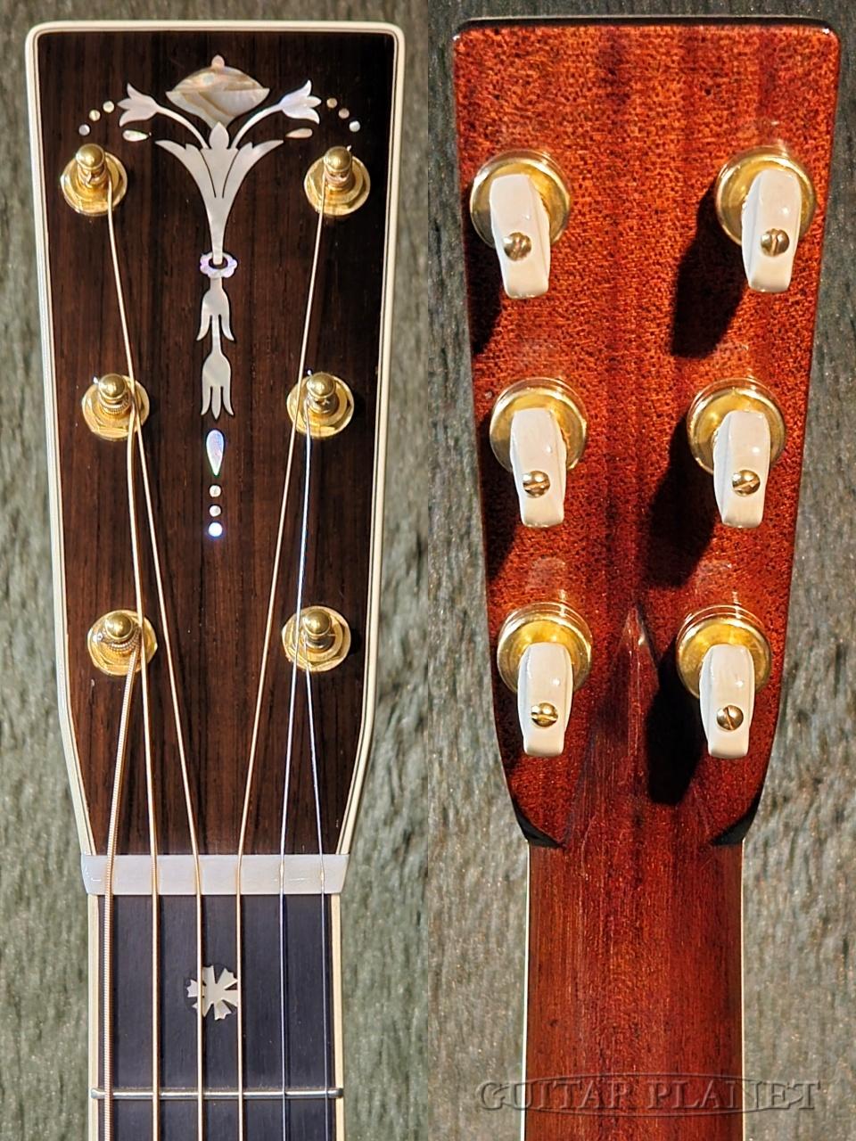ニカワ接着、極薄のオールラッカー塗装、トーチインレイ・ヘッドストック、スタイル45のロゼッタデザイン、アイボロイド・バインディング、モザイク・バックストリップ、トップとバックで幅の違うアバロン貝による装飾や、このモデルの為にハンドカットしたブリッジピンなどオリジナルに準じた形状に隅々まで徹底的にこだわった仕様となっています。