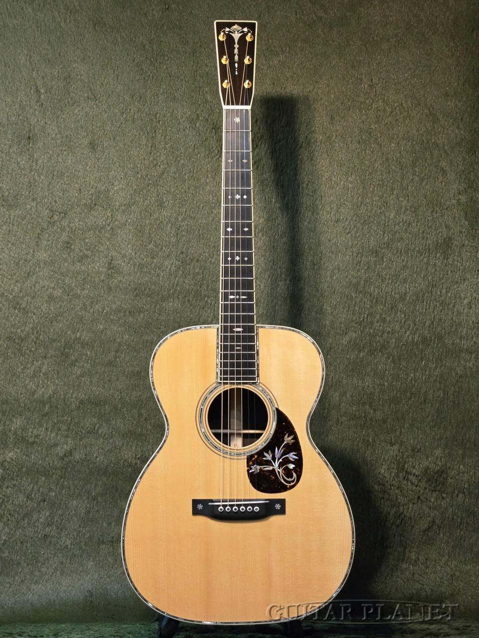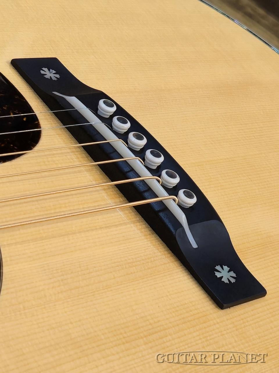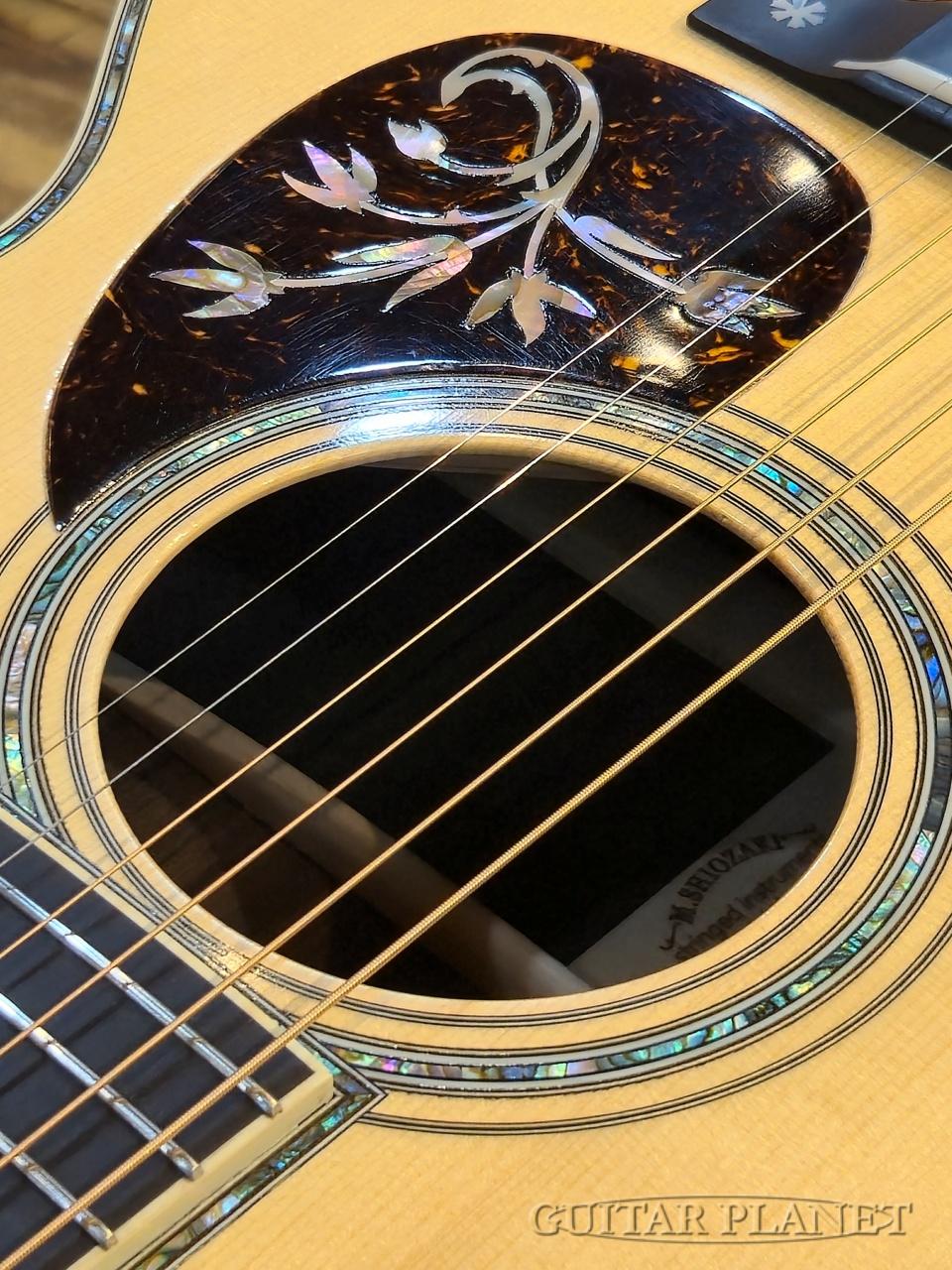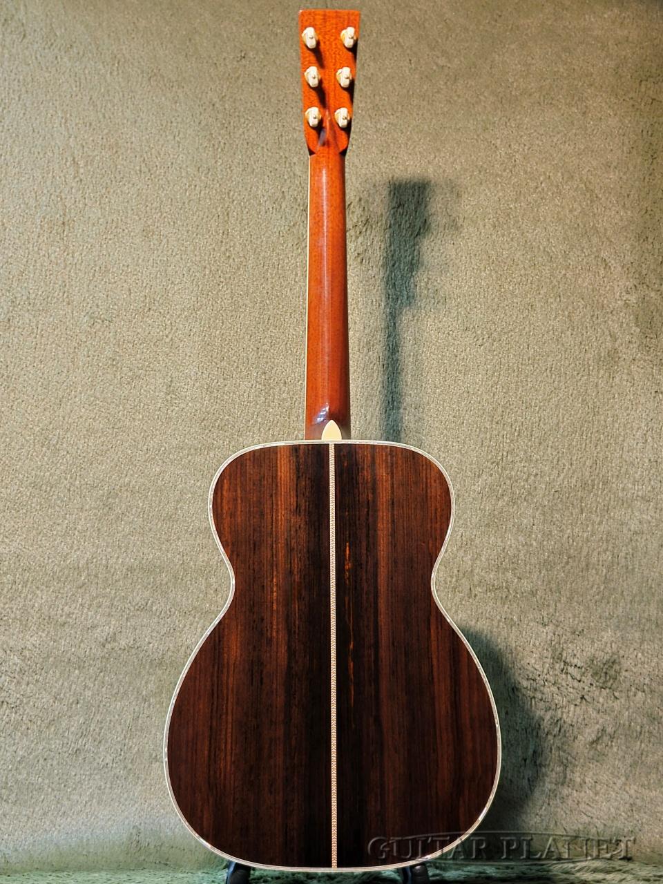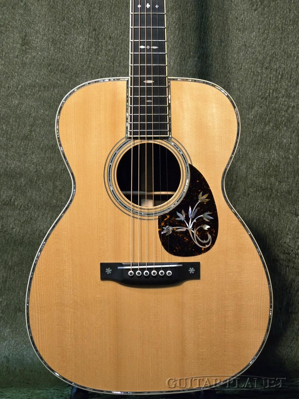 ニカワ接着、極薄のオールラッカー塗装、トーチインレイ・ヘッドストック、スタイル45のロゼッタデザイン、アイボロイド・バインディング、モザイク・バックストリップ、トップとバックで幅の違うアバロン貝による装飾や、このモデルの為にハンドカットしたブリッジピンなどオリジナルに準じた形状に隅々まで徹底的にこだわった仕様となっています。
