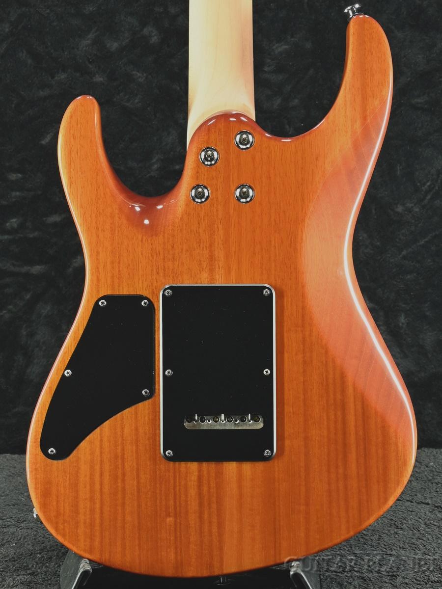 ヘッドトップもキルトメイプルをラミネートしたマッチングカラー。ホーン付近~フロントピックアップ付近は大ぶりな杢が並び、ボディ下部は細かめのものが詰まっており1本で様々な表情を楽しむことが出来ます。通常モデルよりゴージャスな統一感のあるルックスの一本です。