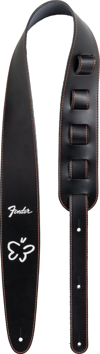 正面にはFenderのTransitionロゴにあわせて塩塚モエカ本人がデザインしたアイコニックな蝶のイラストが、また使用時背中に当たる細いパーツの先端には塩塚モエカのサインが箔押しによって刻印されています。