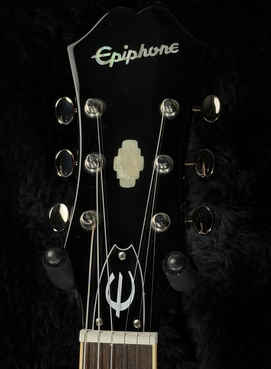 このリビエラの特徴としてメイプル材のトップ、バックとサイド、エピフォンのロゴ“E”があしらわれた3レイヤーのピックガード、エピフォンのアジャスタブルLockTone Tune-O-Maticブリッジとフリークエンセーター・テールピースが搭載されています。