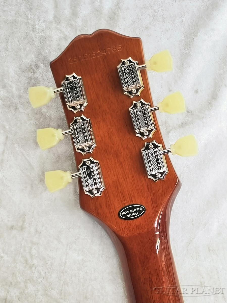 ボディ・トップにはメイプルが貼られ、1959ラウンド・ミディアム・Cシェイプのネックにはバインディングが巻かれロング・ネック・テノン方式でボディにジョイントされています。ローレル指板にはクラシカルなディッシュ・インレイが施され、22フレット仕様のミディアム・ジャンボ・フレットを採用。カラマズー・ヘッドストックにはヴィンテージ・デラックス・チューナーを搭載し、電装系には定評ある2基のProbuckerハムバッカー・ピックアップ、ダイヤル・ポインタ付きのゴールド・トップハット・ノブを採用。Graph Tech®ナット、CTSポット、往時の製法に則った配線など、拘りの仕様群により魅力が一層高められています。Epiphoneプレミアム・ギグバッグが付属となります。