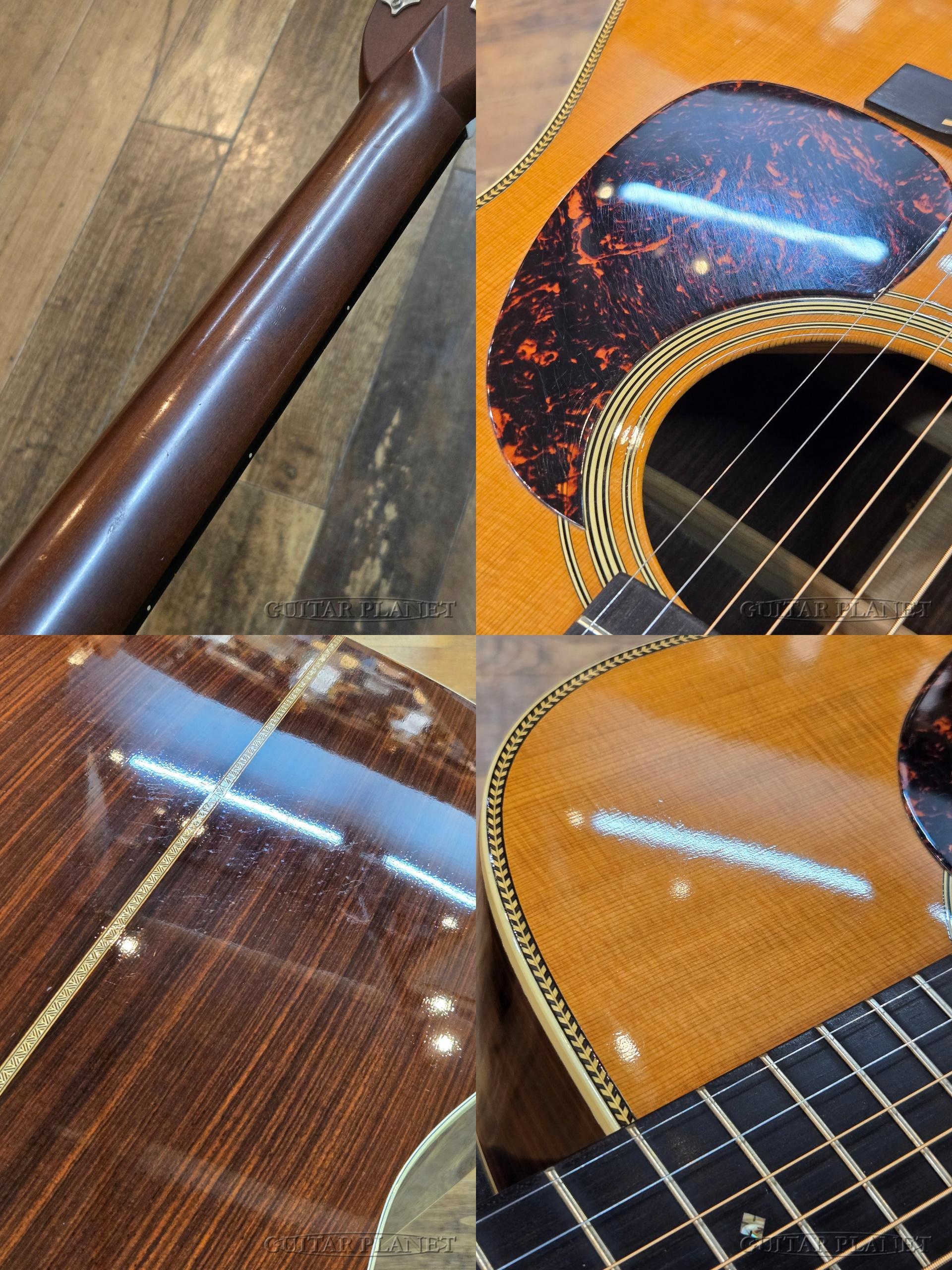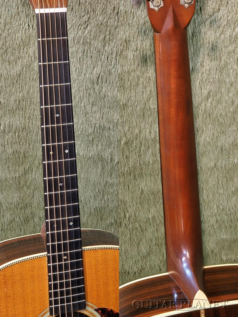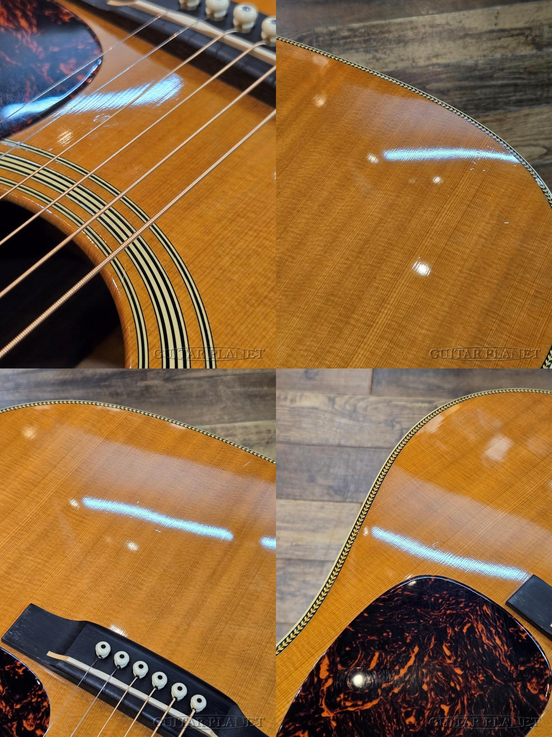 戦前仕様に見られる、フォワードシフテッド・スキャロップドXブレーシング、ヘリンボーン・トリムにアイボロイド・バインディング、ダイアモンド&スクエアの指板インレイ、バタービーン・タイプのペグ、ロングサドル、42.9mmのナット幅にVシェイプのネック、べっ甲模様のピックガード、化石化した象牙のサドル材などを採用しています。