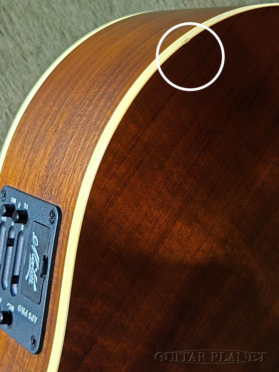画像をご覧頂くと分かる通り、ネック裏に使用に伴う塗装の艶及び小傷、ボディバックのバインデイングに小さな打痕が見られます。