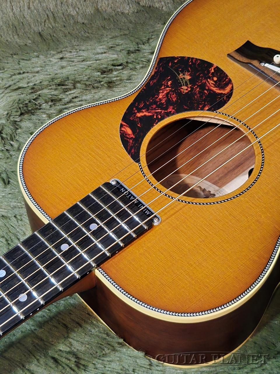 ヴィンテージ・アンバー・バーストにヘリンボーントリムの組み合わせは定番ながら、メイトン独特のオリジナリティあるルックスに仕上がっています。
