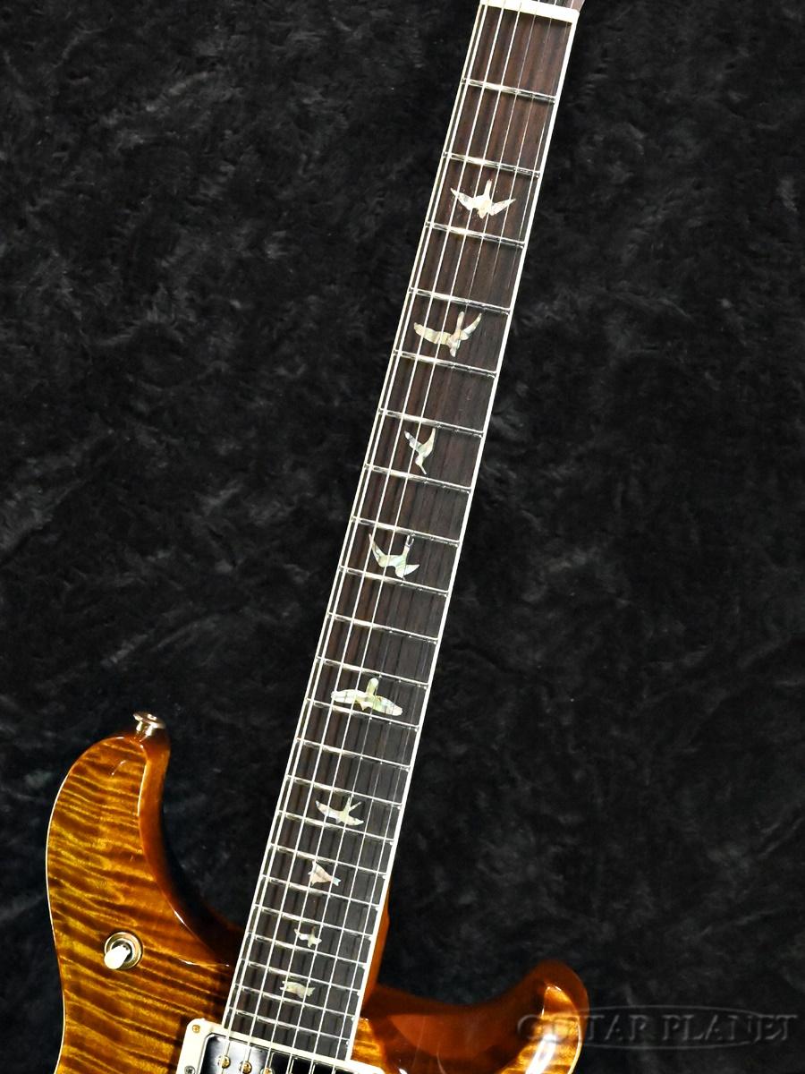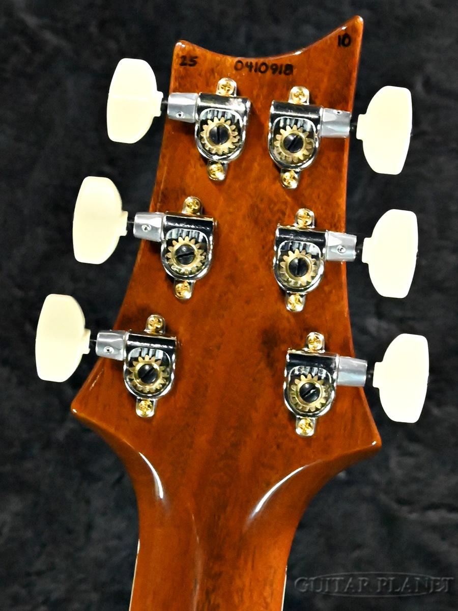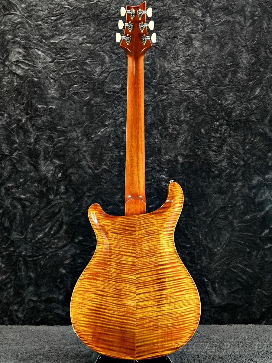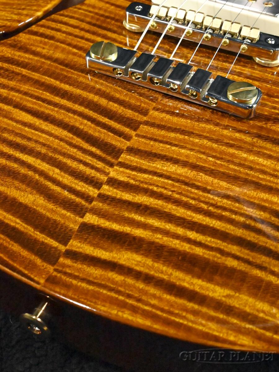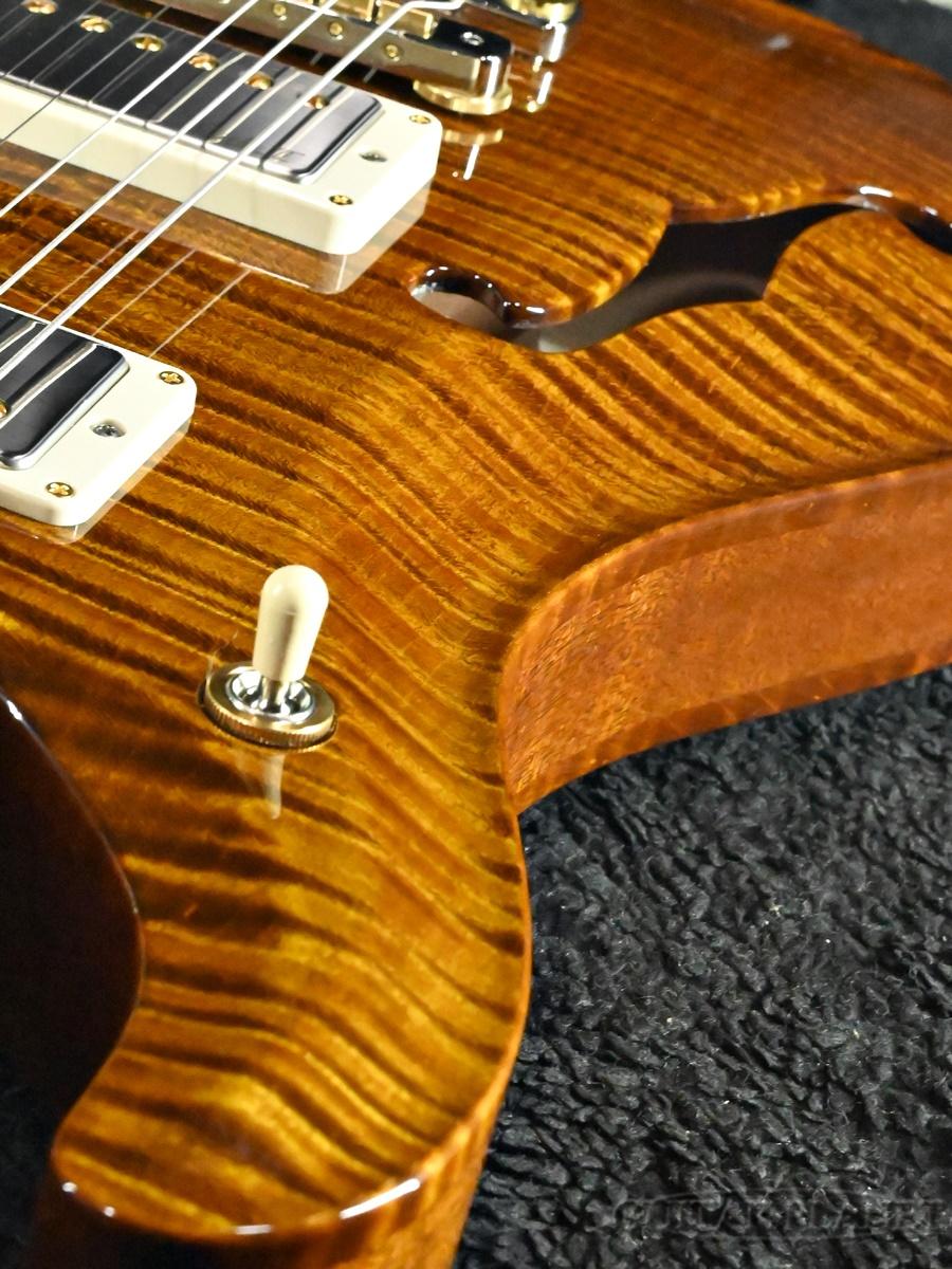 カラーはブラックゴールドという、定番カラー「Black Gold Wraparound Burst」のバーストが無い版のようなものとお考えください。こちらはホロウボディのためCustom等と異なりトップとバックにメイプルがあしらわれており、もちろんその両面が10TOP。つまり10TOPグレードの材が通常の2倍使われているって…コト!?