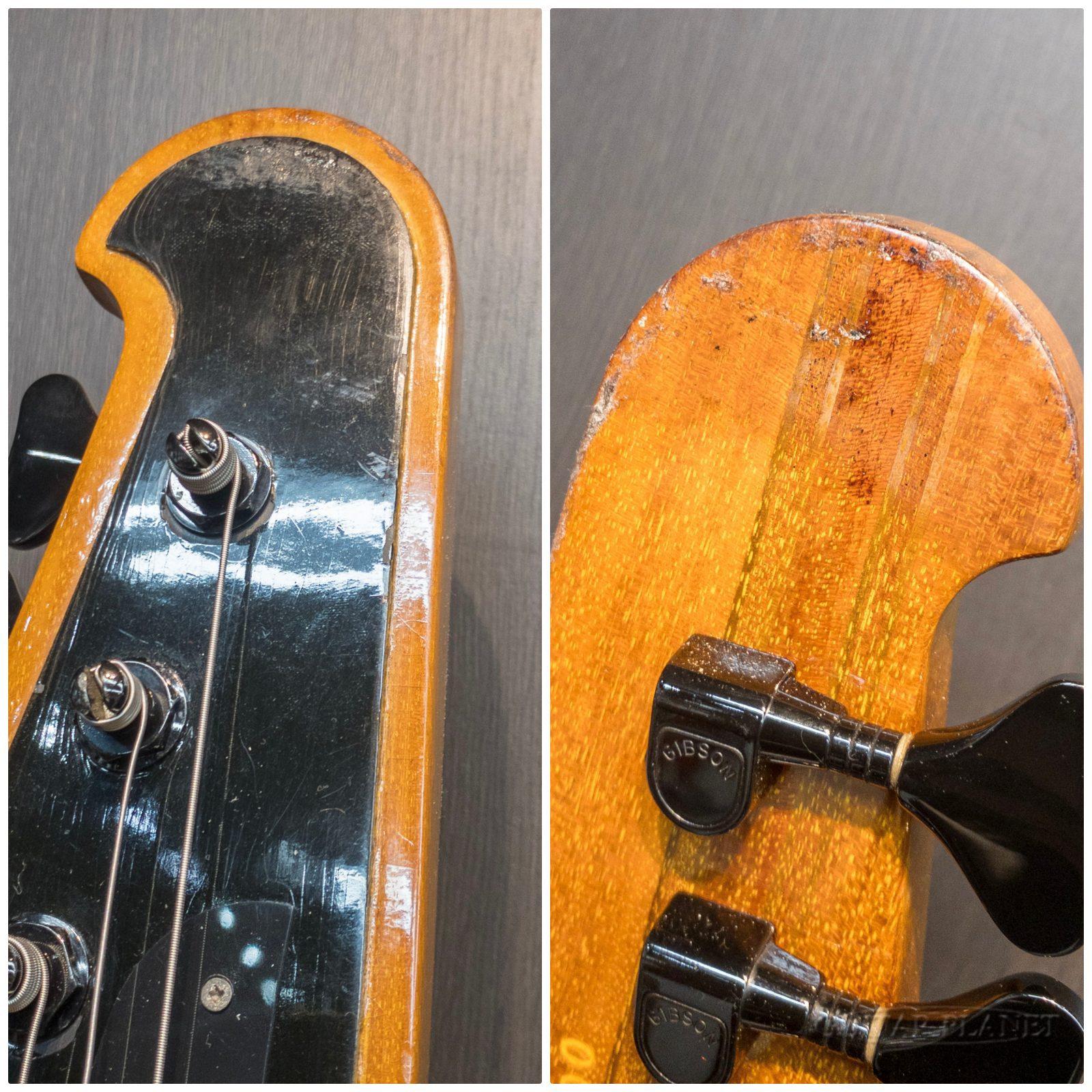 擦り傷や打痕といったダメージは随所に見られる他、ピックガード先端の欠けなど使用感を感じる状態で、良い渋さを醸し出しています。フレットの高さは5割〜6割程度の残りで、指板面の特異な凹みやネック全体の改善困難な癖はなく、快適な操作性を保持しております。