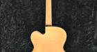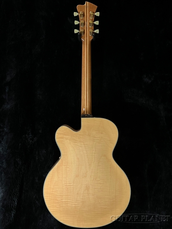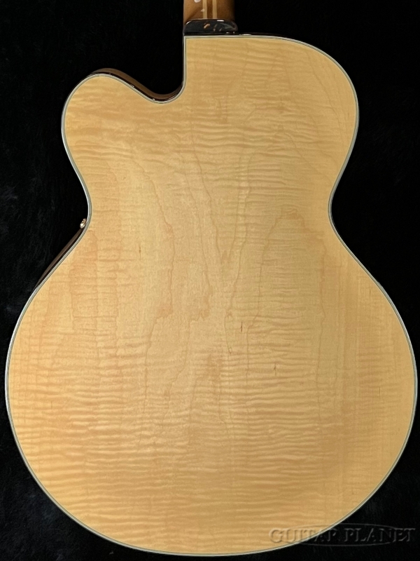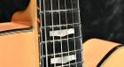 本機は16インチ幅のスプルーストップ、カーリーメイプルサイド&バックボディに、エボニー指板を貼り合わせた5ピースネックがセットネック構造にてジョイントされております。