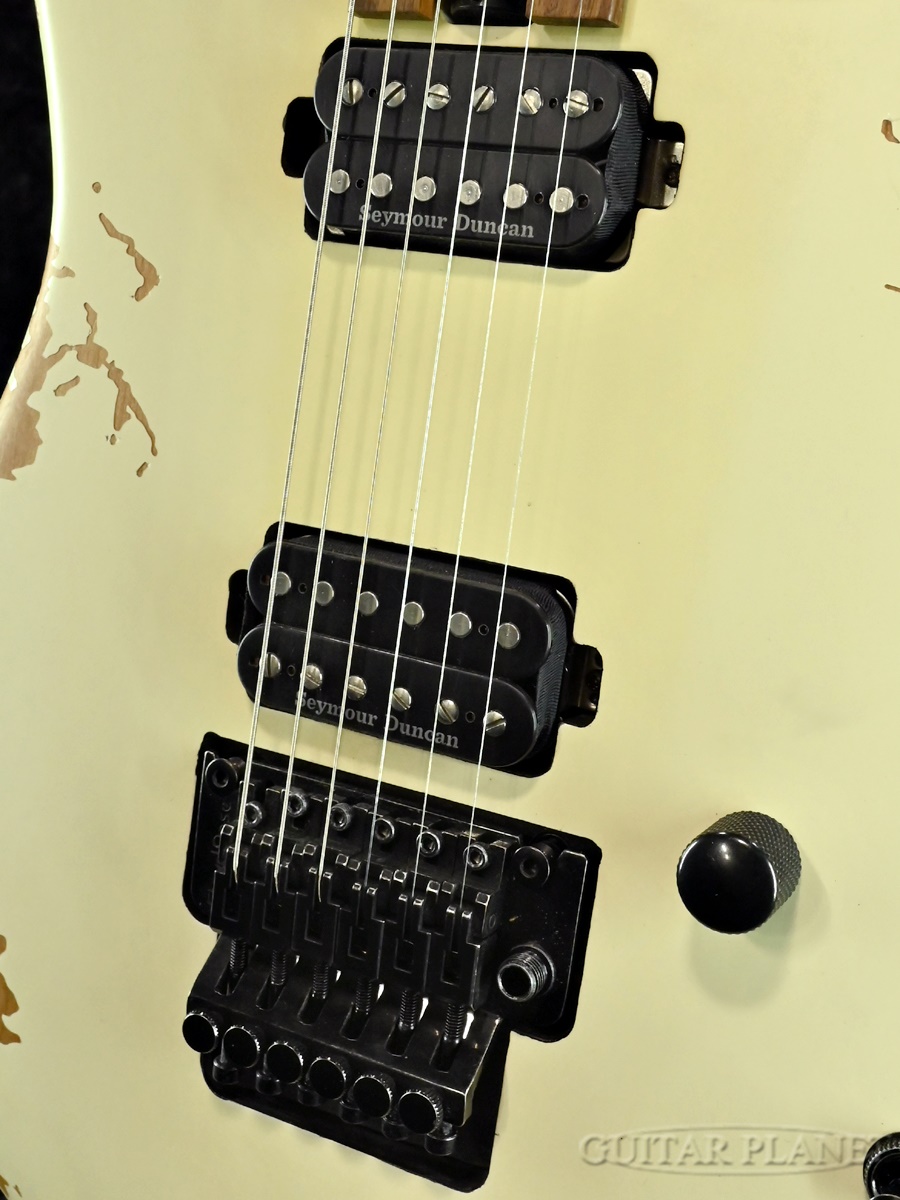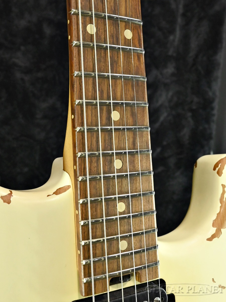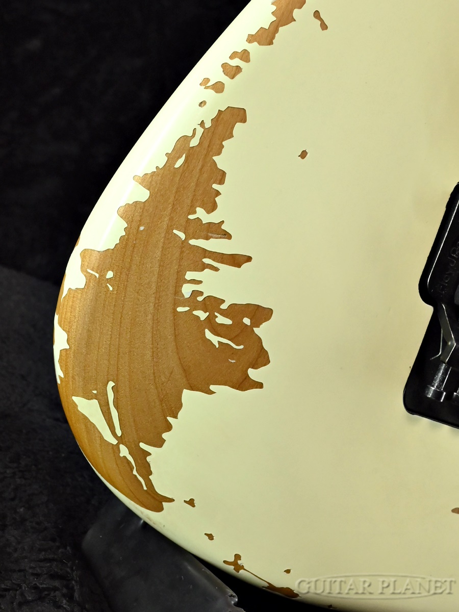 ラッカー塗装によって仕上げられたまるで長年弾き込まれて来たかの様なレリック加工と塗装の質感がカッコ良く、少しマットな質感を持つホワイトカラーがまるでアンティークライクな雰囲気を醸し出してくれます。
