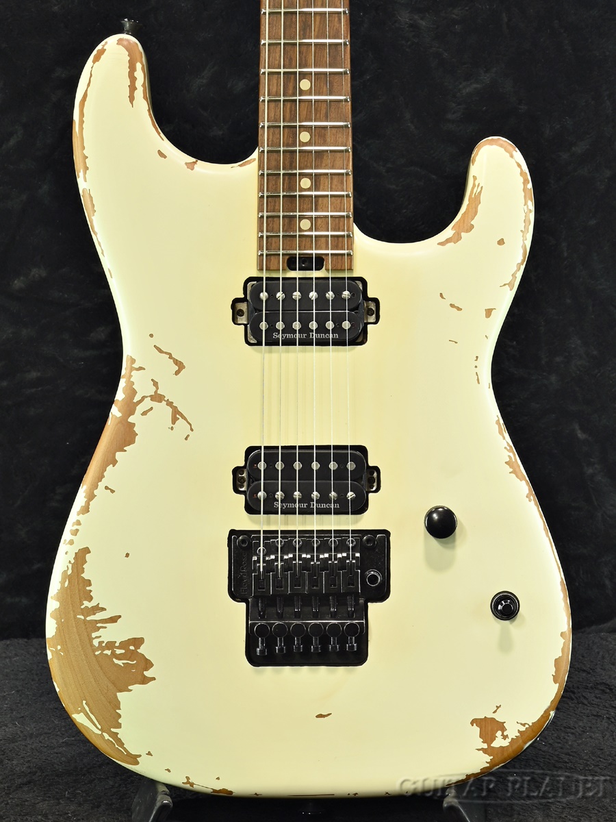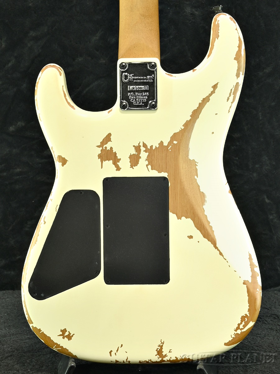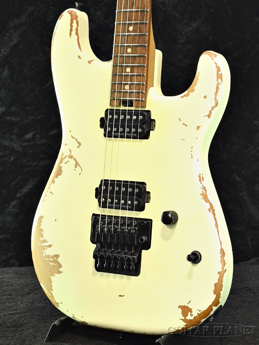 ラッカー塗装によって仕上げられたまるで長年弾き込まれて来たかの様なレリック加工と塗装の質感がカッコ良く、少しマットな質感を持つホワイトカラーがまるでアンティークライクな雰囲気を醸し出してくれます。