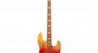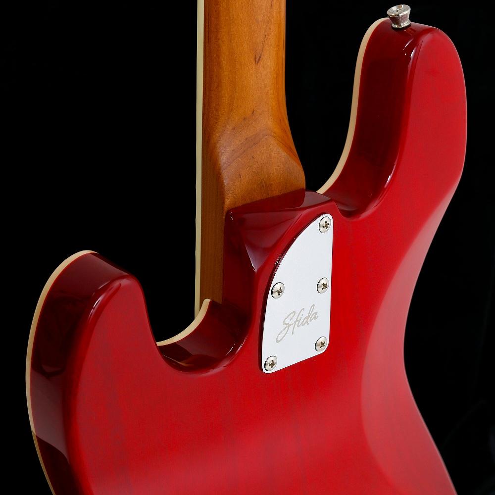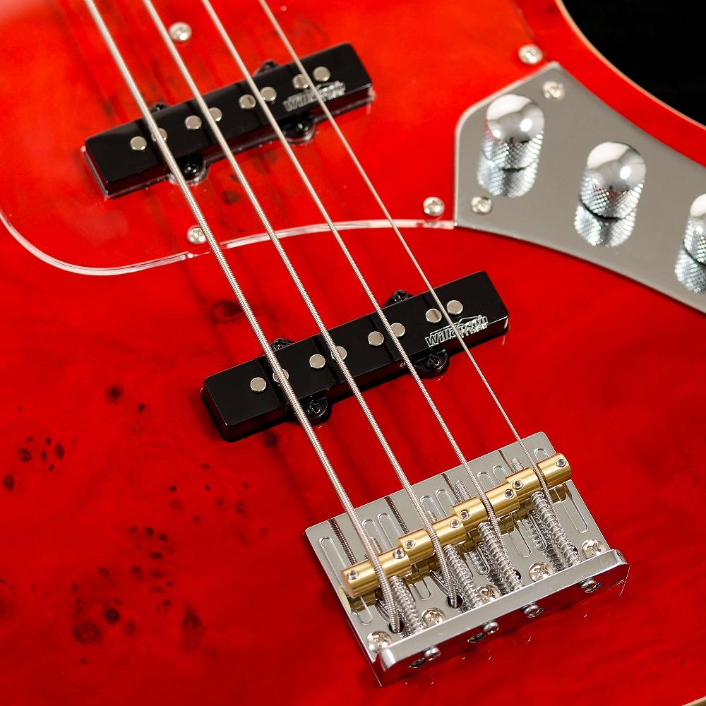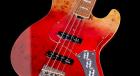 バールポプラトップを採用したJBスタイル「SJB-800」は、美しい木目を引き立てるカラーリングに加え、ローステッド・メイプルネックやネックバインディング、ブロックポジションマークによる高級感あふれるルックスが特長です。