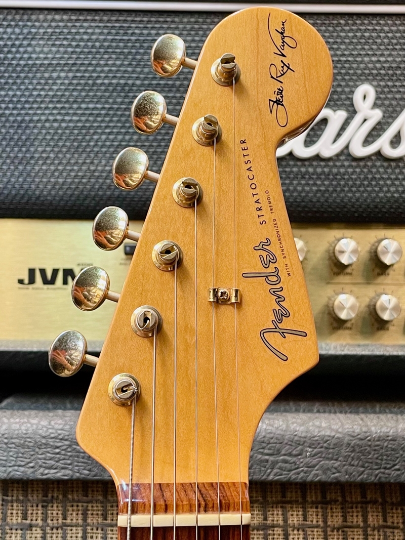 一目で分かるSRVのロゴ付きピックガード、左用のトレモロ、ゴールドハードウェア等シグネチャーモデルらしいルックスを持った品です。