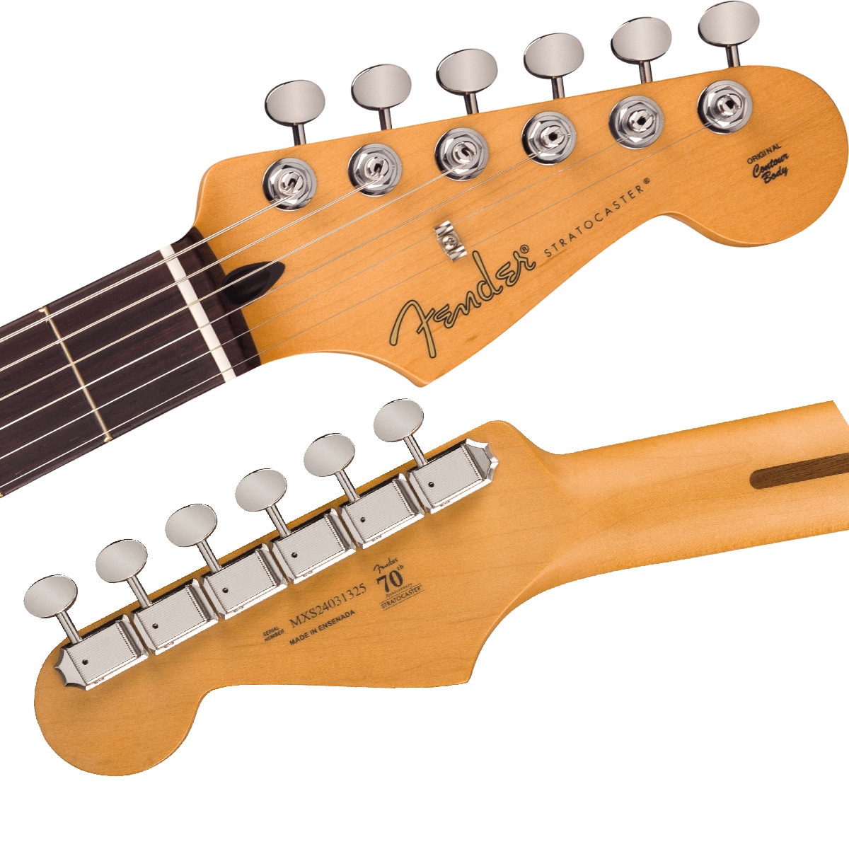 Player II Stratocasterは、時代を超越したフェンダーの魅力を放ちながらも、その中身は現代プレイヤー向けにデザインされています。Modern "C"シェイプのネックバックにはシルキーなサテンウレタンフィニッシュが施されており、丁寧にロールオフされた指板エッジと22本のミディアムジャンボフレットを採用した9.5インチラジアスのスラブローズウッドまたはメイプル指板が、ネック全長にわたり快適なプレイアビリティを提供します。