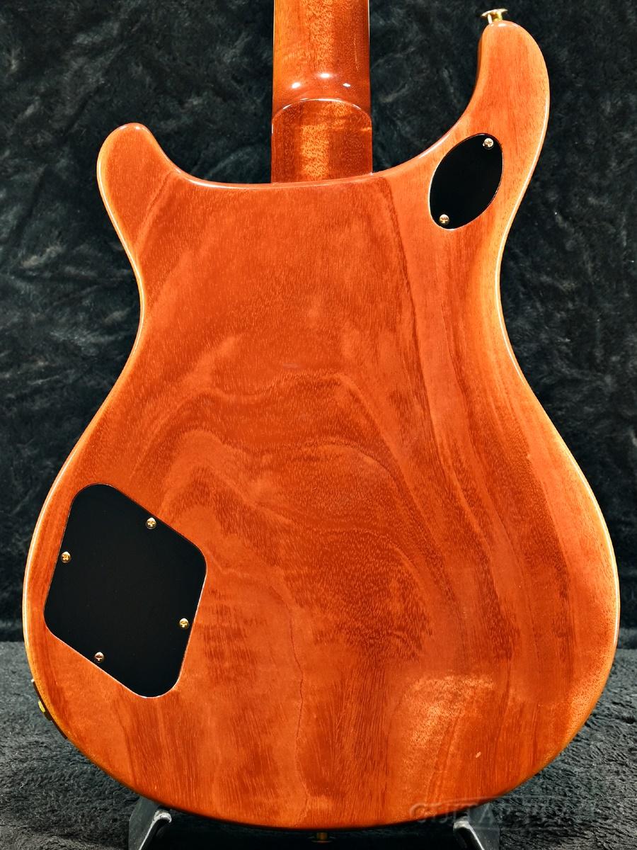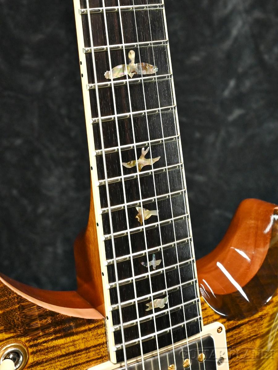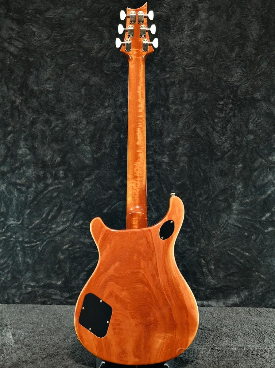 こちらは594といえばのYellow Tigerカラーに組み合わされる10TOPの杢目が非常に素晴らしい仕上がりとなっております。10TOPらしく細めのフレイムがボディ全体にぎっしりと詰まっている様子はこれぞPRSといわんばかりの正統派なルックス。整った杢がお好きな方、フレイムのラインは細めが良いという方へとてもおすすめです。