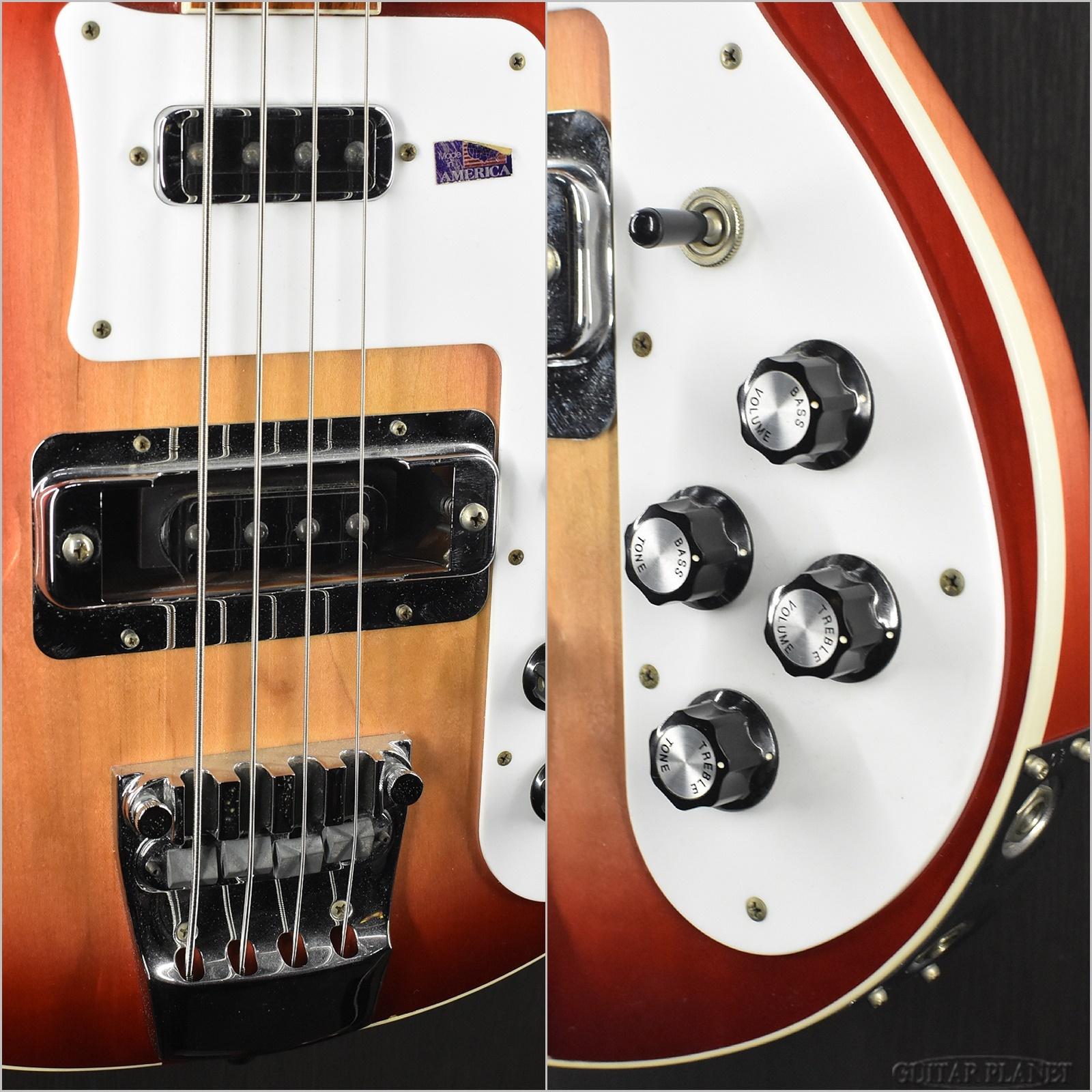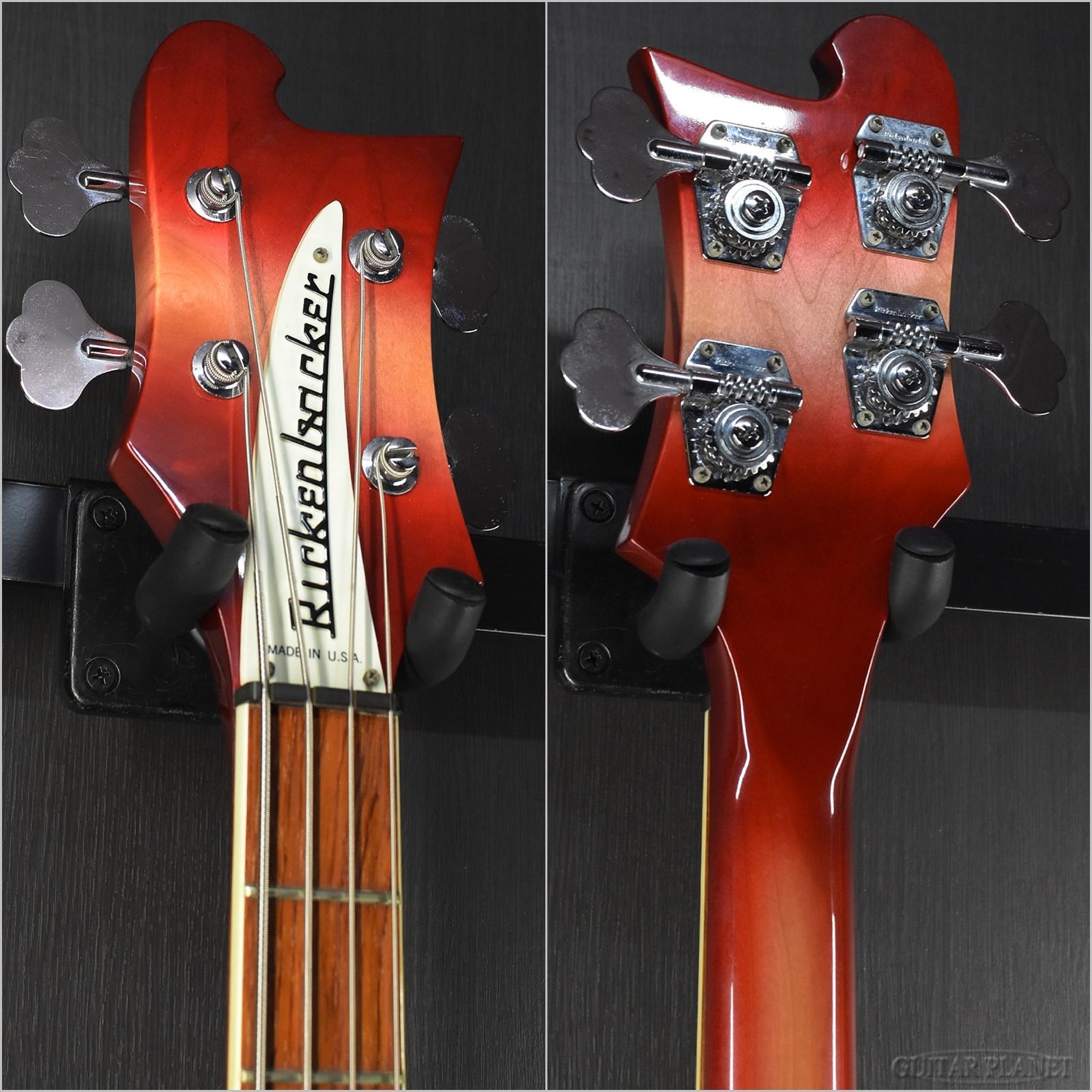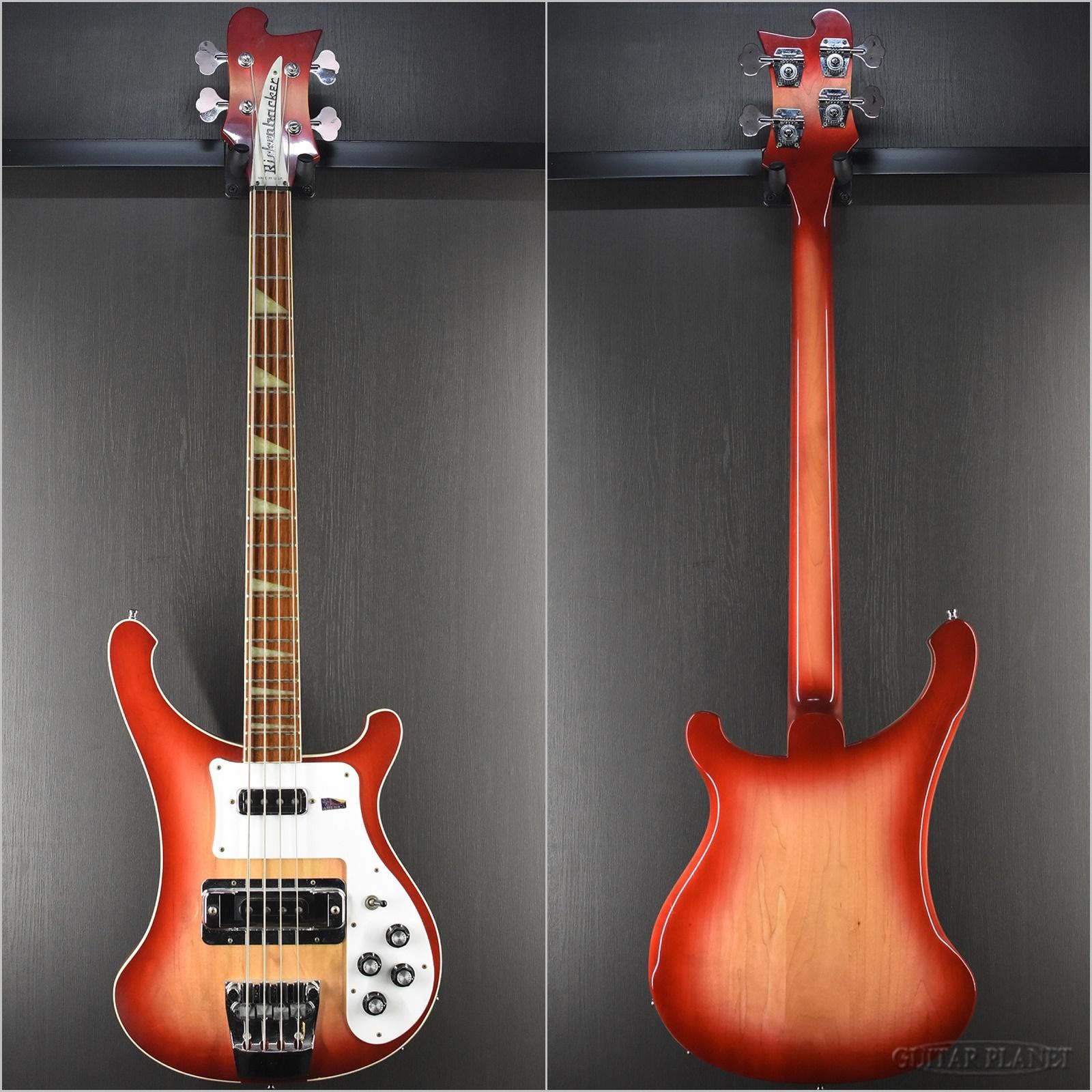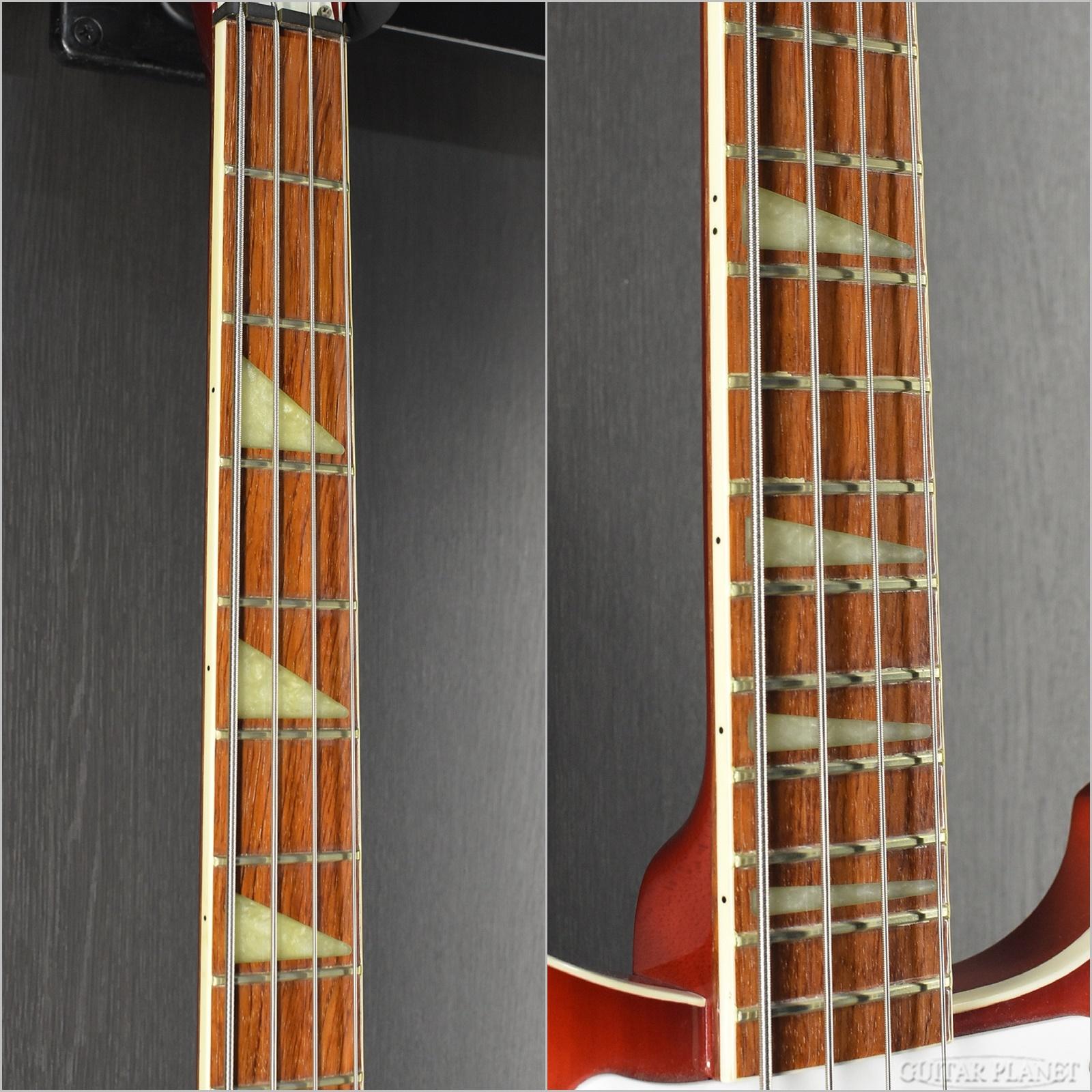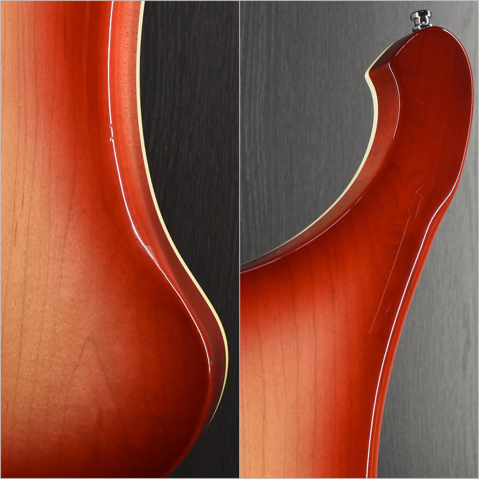リッケンバッカーベースではお馴染みであるスルーネック構造のメイプルネックに、ボディウィングにもメイプルを使用したウッドマテリアルで構築され、メイプル指板以外では見かけることの少ない指板面まで施されたグロス塗装や、トラスロッドを2本仕込んだネック、独自性の高いデザインのハードウェア類など、定番モデルとして認知されていながら個性に溢れた唯一無二感が堪らないモデルであります。