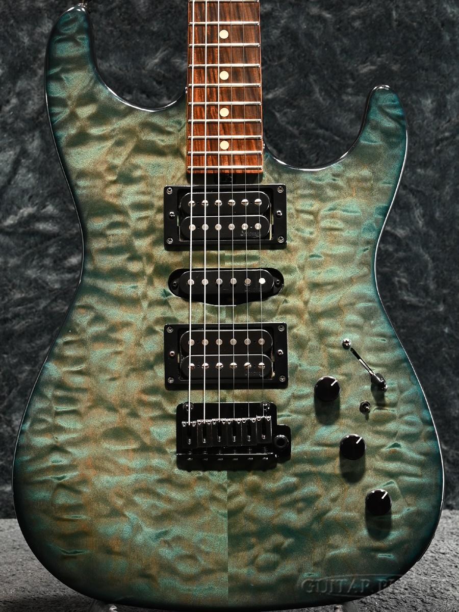 美しいキルトメイプルトップのアルダーチェンバーボディにモラード(ボリビアン・ローズウッド)指板を組み合わせたメイプルネックのウッドマテリアル。