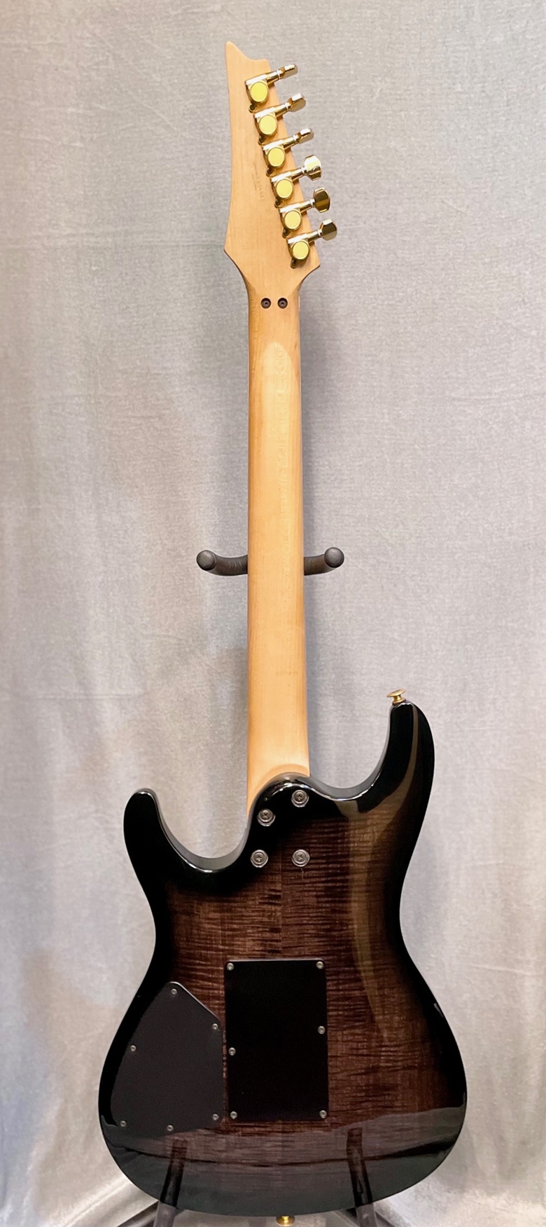 特徴的な薄型ボディに前後に杢目の美しいフレイムメイプルをサンドし、更にはゴールドパーツをあしらう等高級感のあるルックスに仕上げられた品です。