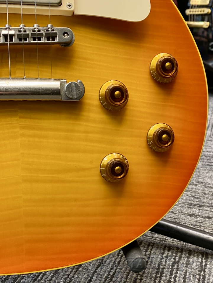 軽量なマホガニーネック&ボディに美しい木目のラミネート・メイプルトップ、ややくびれの強いアーチトップ加工で仕上げられています。