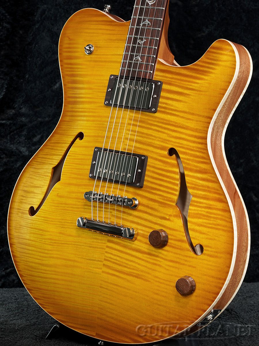 約15.75インチ幅フレイムメイプルトップ&バック、マホガニーサイドのボディに、イースト・インディアン・ローズウッド指板を貼り合わせたマホガニーネックがセットネック構造にてジョイントされております。