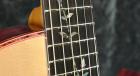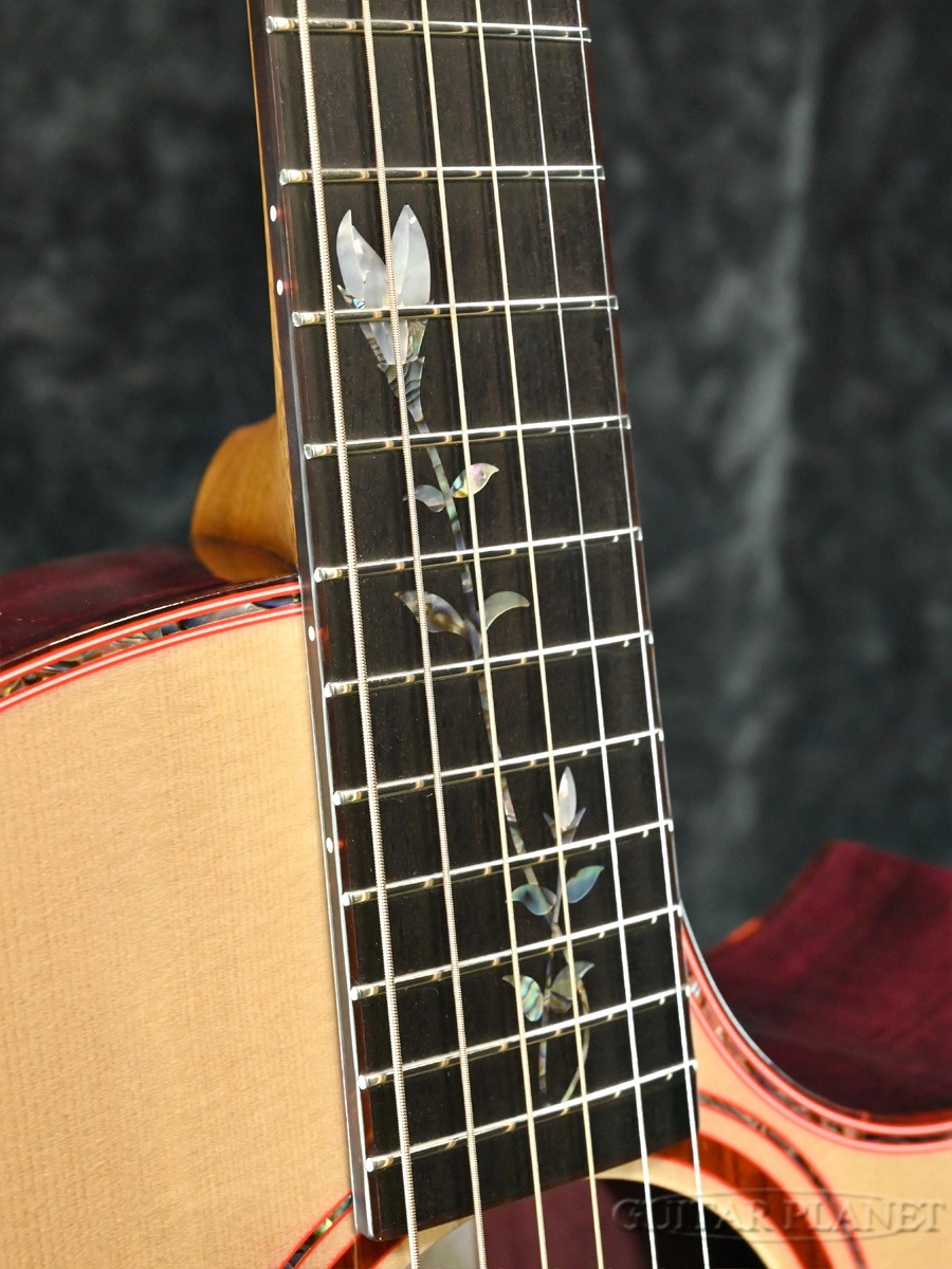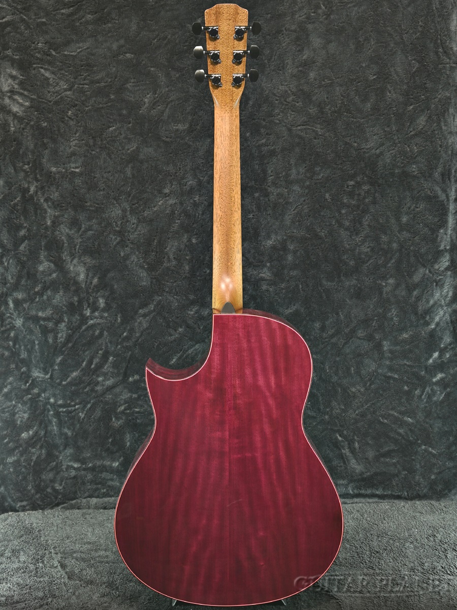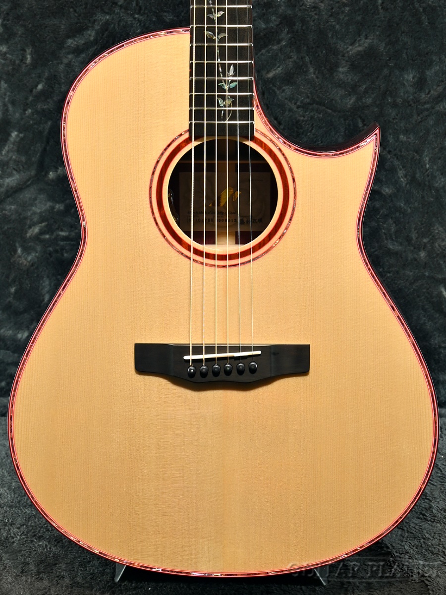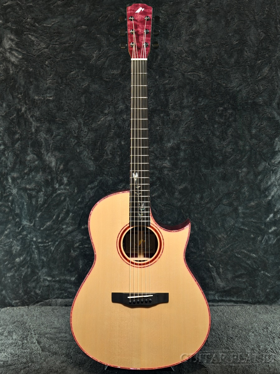 フレットボードにはリンドウをモチーフにしたインレイを施し、パープルハートに合わせたパーフリングで華やかさと個性を演出しています。