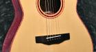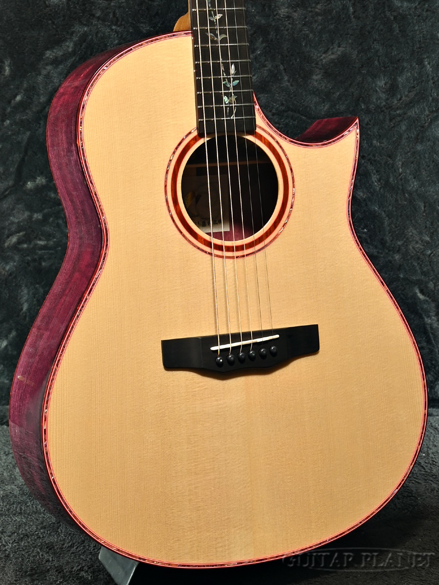 サイド・バックには鮮やかな紫色と明瞭なサウンドが特徴のパープルハート材を使用。パープルハートは硬質でコアやメイプルに近い木材特性をもち、レスポンスの良さを発揮します。インゲルマン・スプルースとの組み合わせにより、柔らかさと反応性の絶妙なバランスを実現しています。