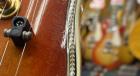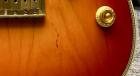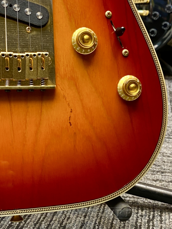 Damage: Scratches/dents, paint cracks/chips/wear, tarnished parts/rust/peeling plating, tuning peg replacement hole marks, faded headstock logo