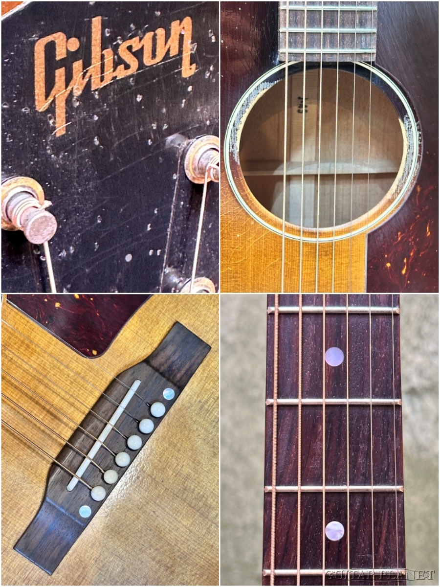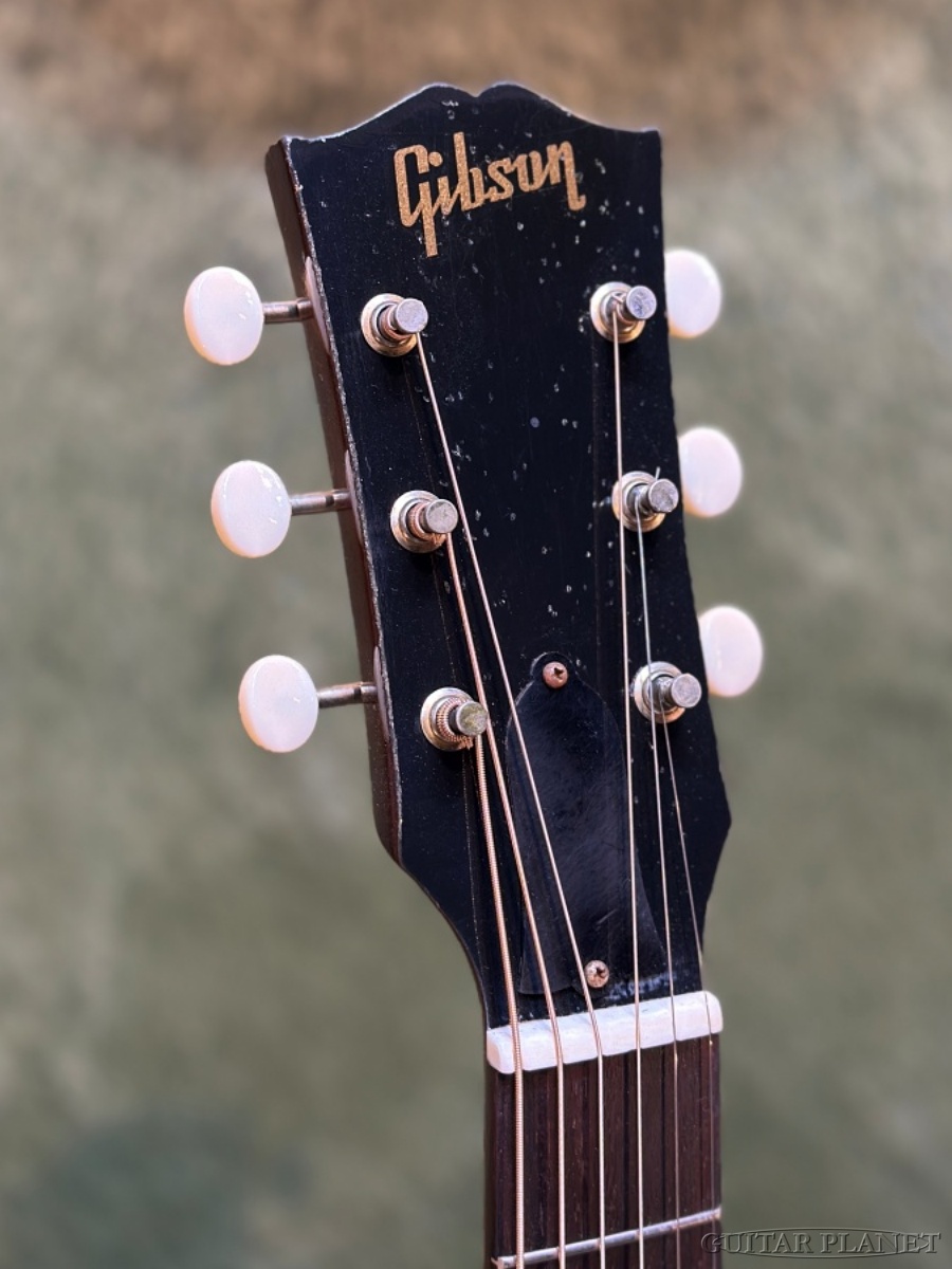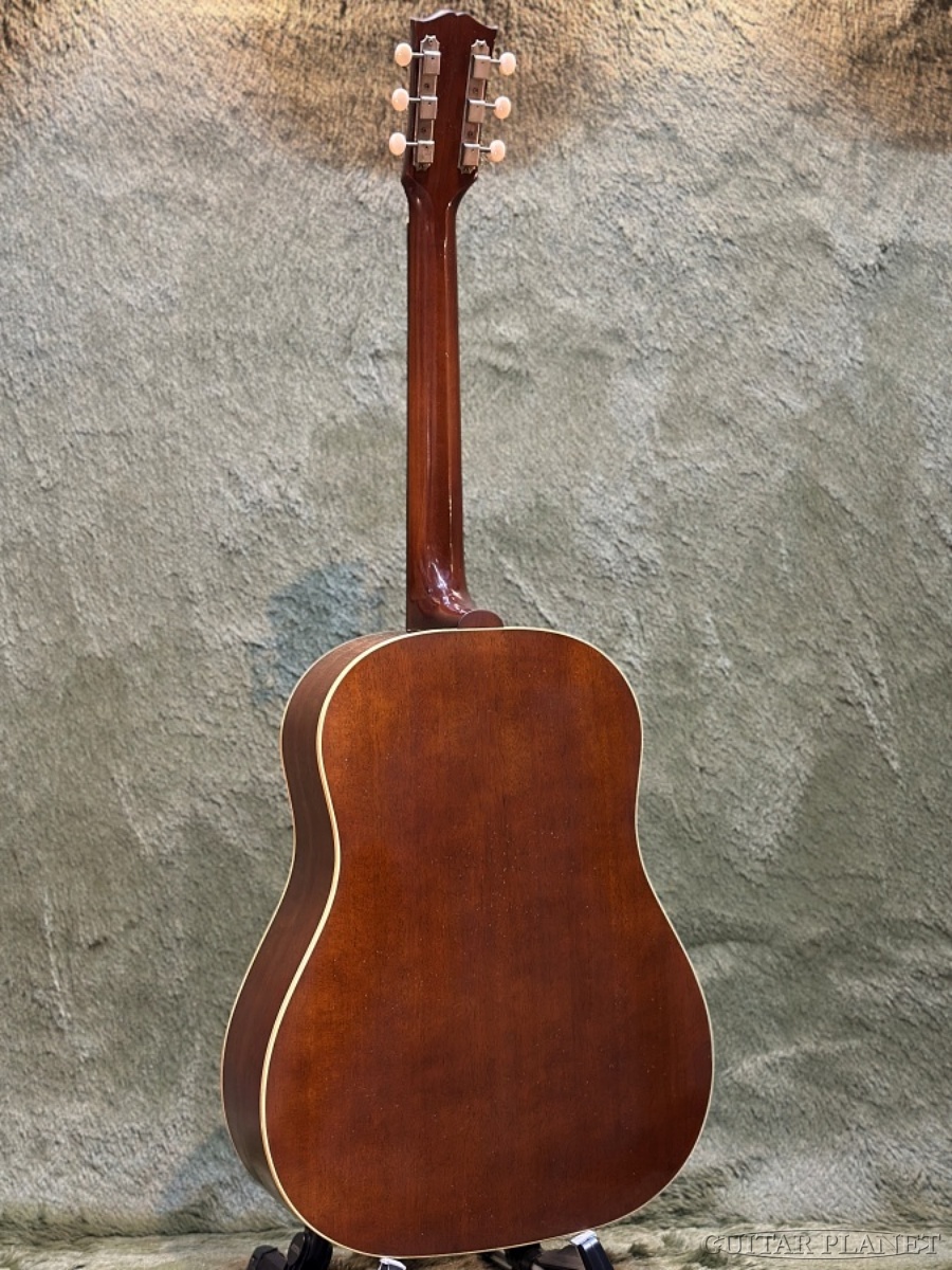 ギブソン・オリジナルシェイプの『ラウンドショルダー』と呼ばれるなで肩のボディのトップには『シトカ・スプルース』、主にアラスカ産を使用し、さらに特殊な熱処理により木材に炭素化する直前まで細胞レベルで変化を与える事で、長年使用されたヴィンテージ楽器と同様のサウンドが得られる『サーマリー・エイジド』加工が施されています。(ブレーシングもシトカ・スプルースを使用しニカワで接着)サイド&バックには純種の『ジェニュイン・マホガニー』中南米エリアの主にグァテマラン産を使用され、全体的に軽量な仕上がりです。ネック材も同様に『ジェニュイン・マホガニー』、指板&ブリッジには『インディアン・ローズウッド』を使用し、発売当初のマテリアルも限りなく再現。