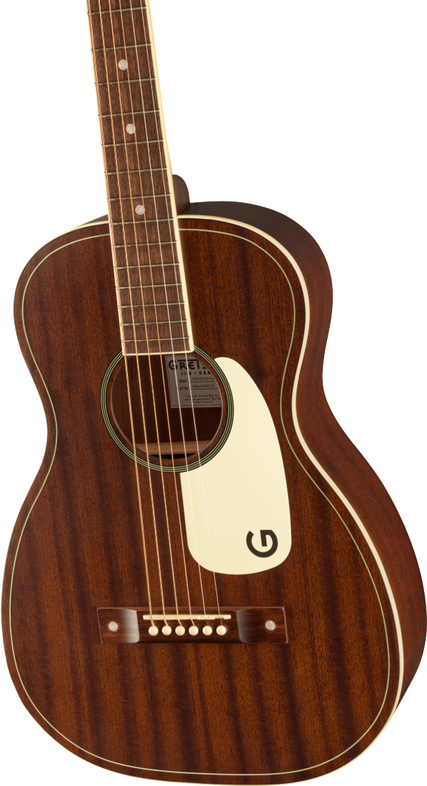 Xブレーシングを施したボディには厳選された軽量ラミネート材を使用し、ウッディなヴィンテージトーンと耐久性を最適なバランスで実現しています。ヴィンテージスタイルのピンブリッジ、"G"グラフィック入りピックガード、ペイントされたピンストライプパーフリング、"3-on-a-plate"オープンギアチューニングマシン、オーバーサイズドットインレイなど、当時の仕様に忠実なディテールがノスタルジックな個性を醸し出します。