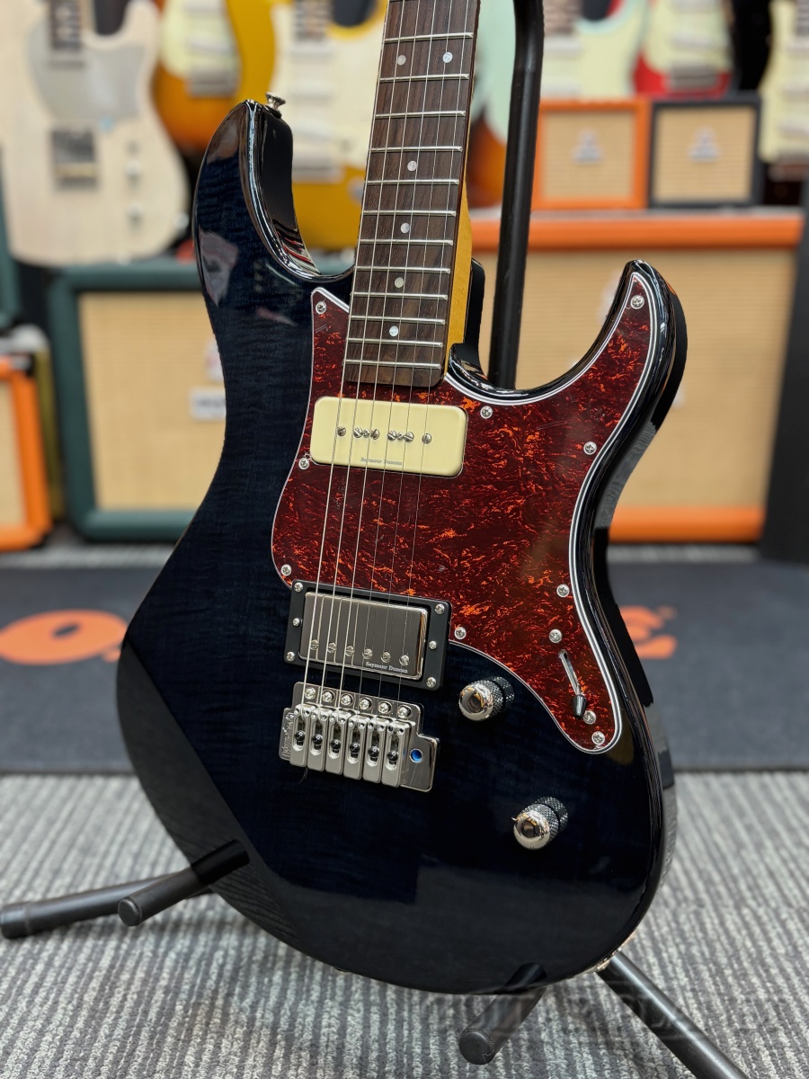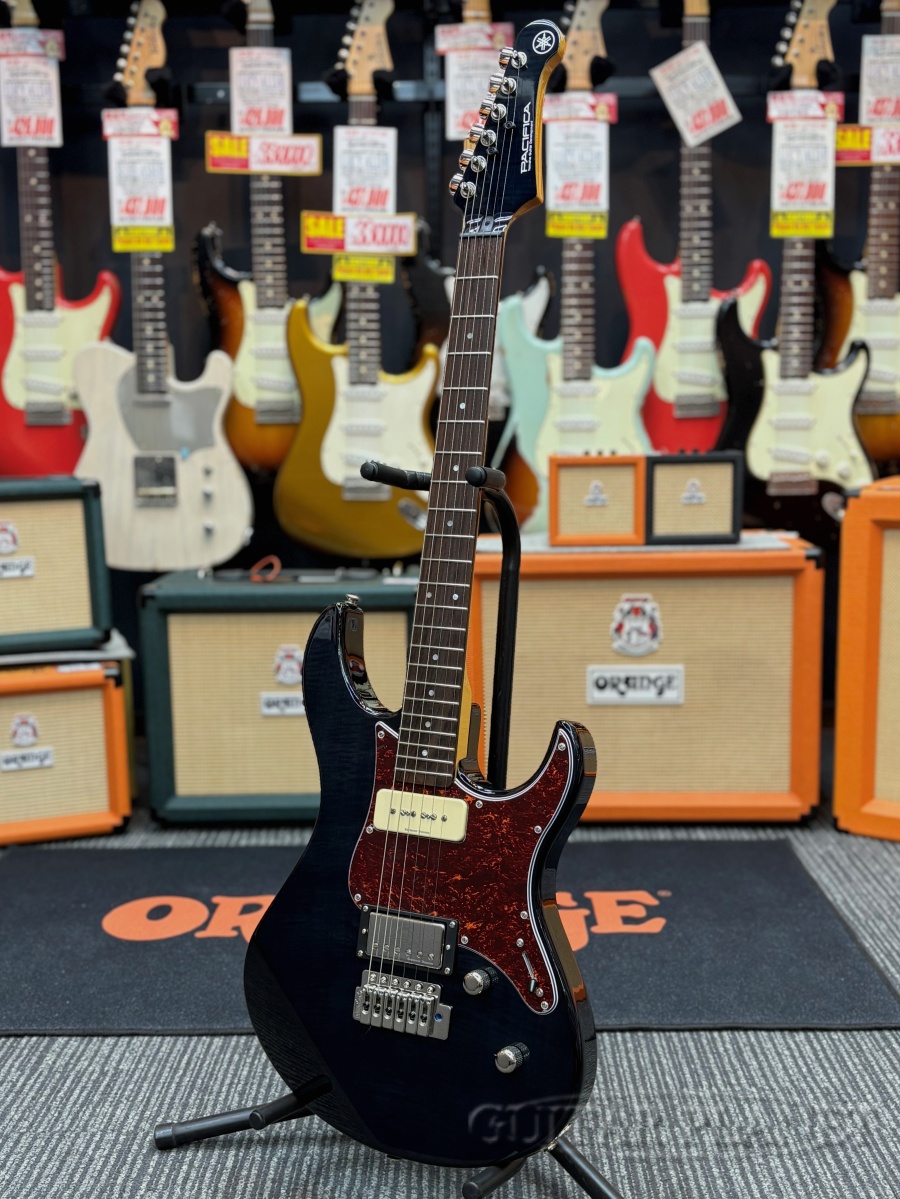 フレイムトップにシースルーカラー、べっ甲ピックガードの組み合わせが美しくスマートな印象を醸し出します。