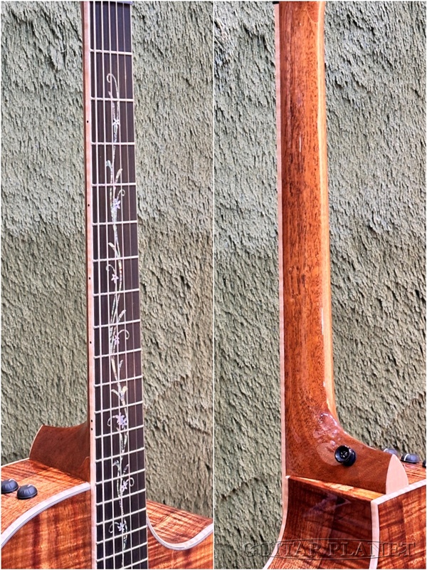 パウア貝とマザーオブパールから製作されたIsland Vineインレイが指板とヘッドに輝きます。