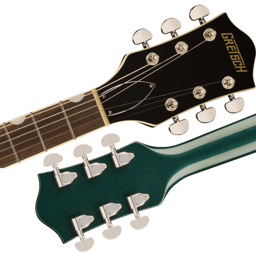 G2420 Streamliner Hollow Body Single-Cut with Chromatic II Tailpieceは、豊かな響きと深いレゾナンス、スケール感のあるビッグボディサウンドを実現するパラレルトーンバーを備えたフルホロウ構造のアーチドメイプルボディを採用しています。