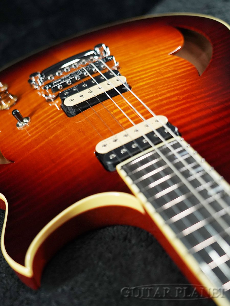 特筆すべきは、ミディアムスケールを採用し製作されているという点です。マルキオーネギターはどのモデルにも基本的にはロングスケール(25.5インチ)が採用される為、他メーカーのギターよりもプレゼンス成分が多く高域に主張が強いサウンドに仕上がるが故、サウンドメイクやコントロールが難しいとされています。ですが、ミディアムスケールを採用する事により所謂セミソリッド構造から生まれるエアー感を含んだトーンを高次元でアウトプットする個体に仕上がっています。サウンドの取扱面において、マルキオーネギターに苦手意識をお持ちだったお客様にもきっとご満足頂けるものと思います。