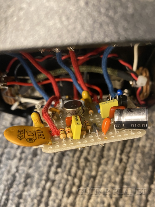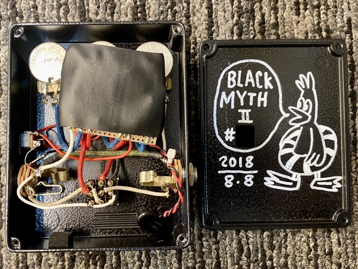 缶タイプのLM308オペアンプをはじめ、ヴィンテージパーツ、ヴィンテージワイヤーを用い手作業(ポイント・トゥ・ポイント配線)で組み込まれており、鋭く迫力のあるサウンドに仕上がっています。