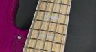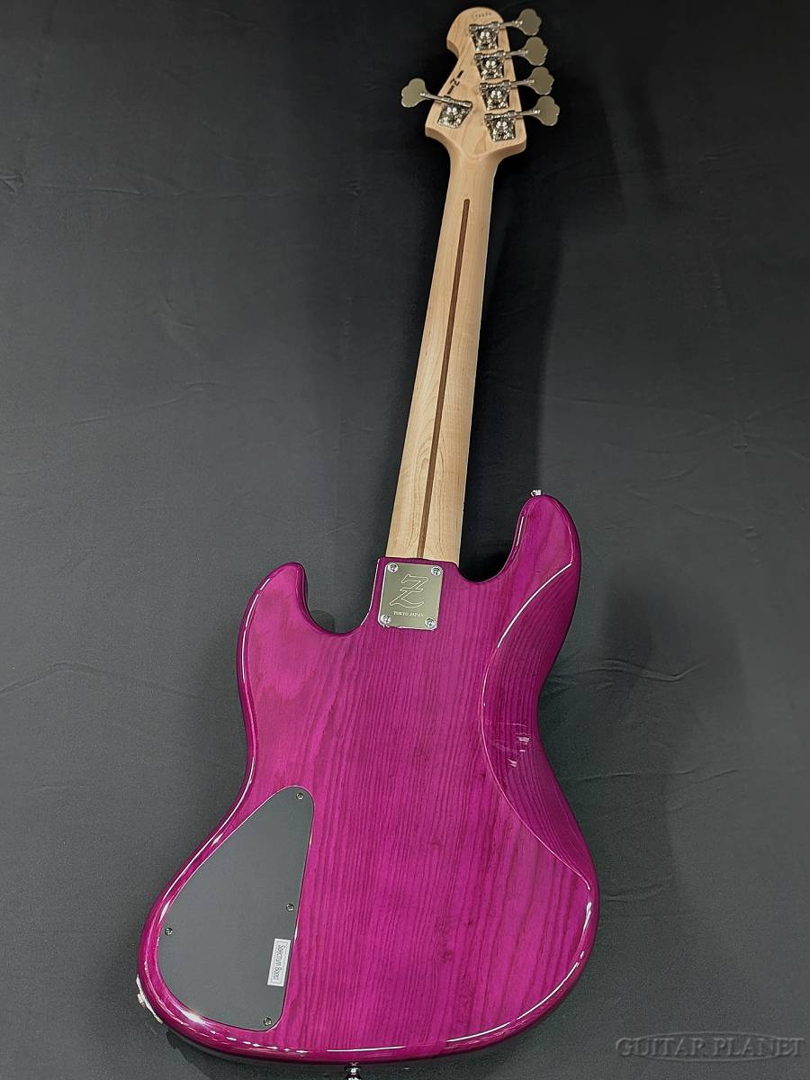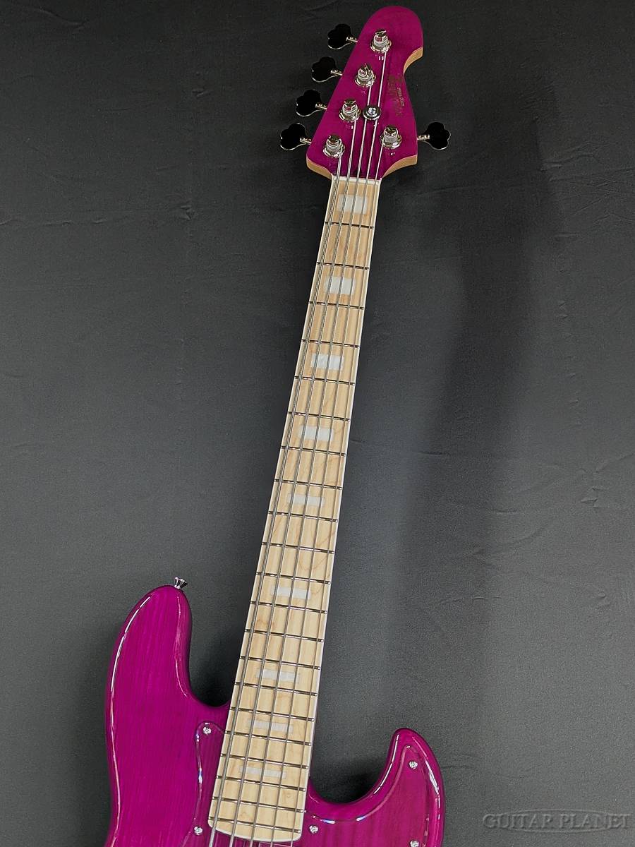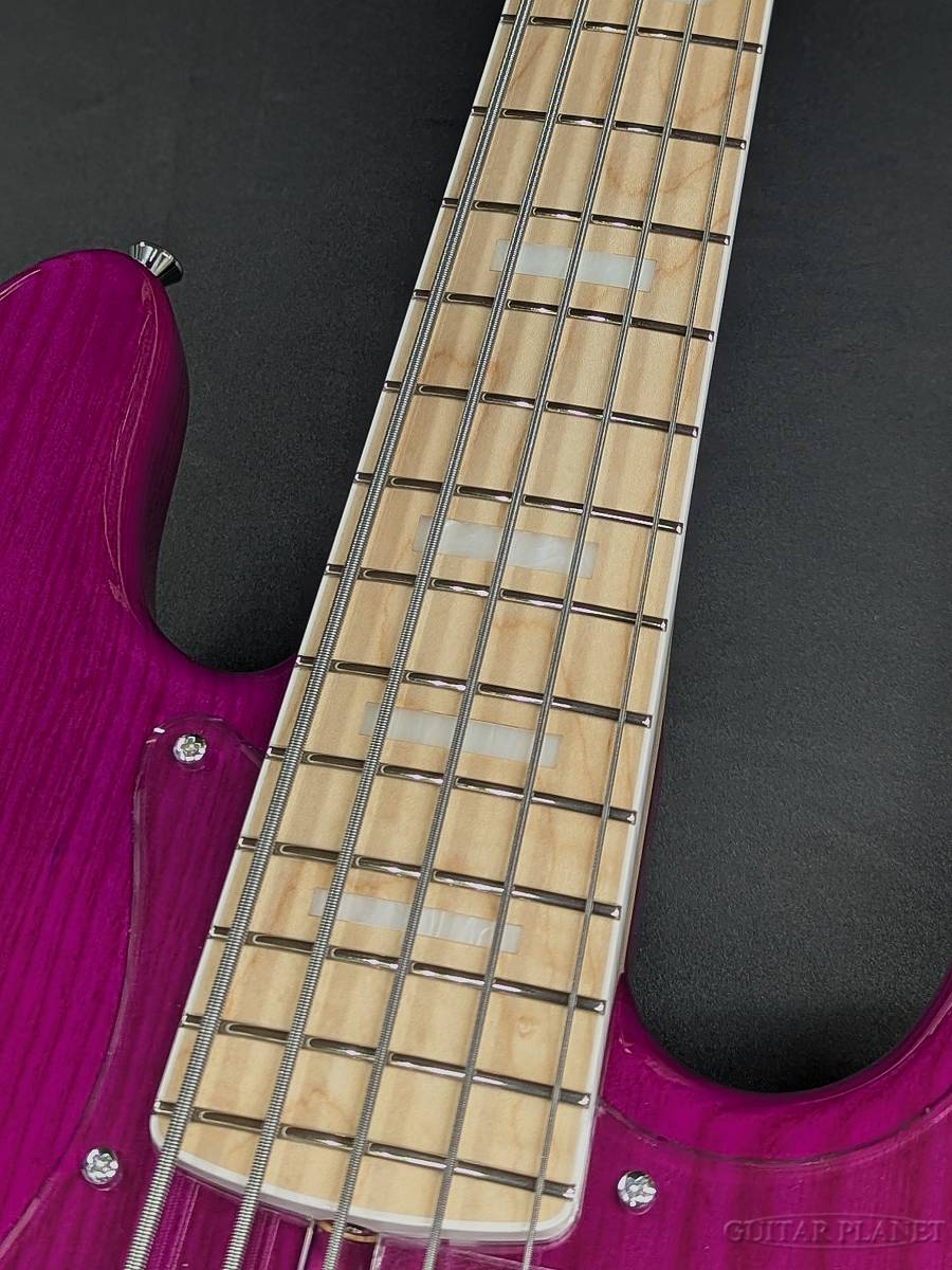 本機は、木目を活かしたシースルーのパープルカラーを纏ったマッチングヘッド仕様のオーダーモデル。アッシュの杢目がうっすらと浮かび上がる深みのある紫は、ステージ照明の下で一層存在感を放ちます。華やかさと高級感を併せ持つルックスは、サウンドのみならず所有欲をも満たす仕上がりです。