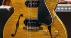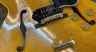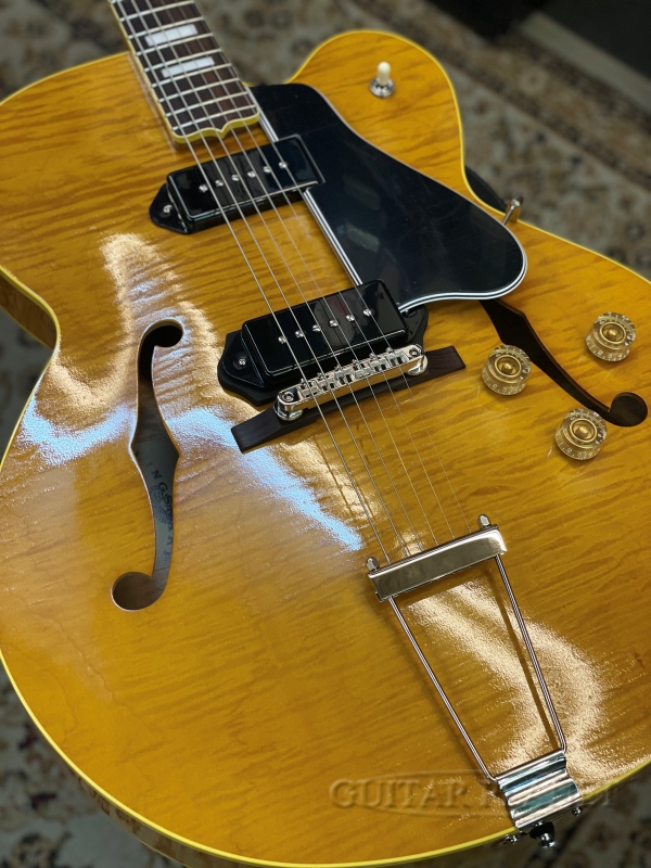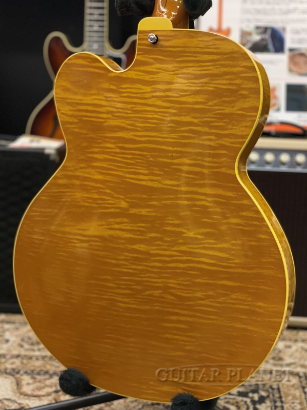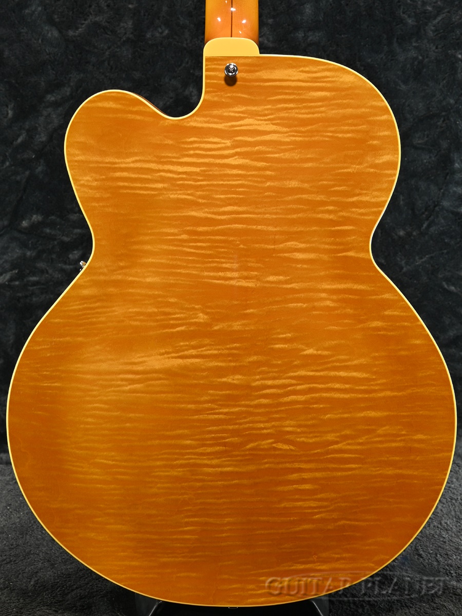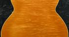 アンプに通した時のトーン、音量を第一に考えてデザインし、フルアコースティック構造ながらもサウンドの芯とサスティーンを得る為にブリッジの裏側に当たる位置に15mmの分厚いスプルース材(幅80mm長さ70mm)を施してあります。これにより通常のフルアコでは得る事の出来ない独特なサスティーンと良い意味でのコンプ感を伴うサウンドの腰の強さが増し、クランチに歪ませた設定でも十分に対応可能です。