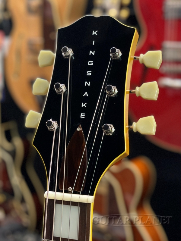 「フルアコ」と言うとジャズを連想がちですが、そもそもソリッドギターが登場する前は、カントリー、ブルース、R&R、大衆音楽など全てフルアコにて奏でられていました。その当時のサウンドと言えば、アンプも黎明期であり、小型のチューブアンプのヴォリュームを上げた、ズ太いドライブサウンドです。その時代のワイルドさも「フルアコ」と言うギターの魅力であると言う事を伝えるべく立ち上がったブランド、それがKING SNAKE(キングスネーク)です。