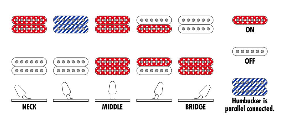 HHピックアップ・レイアウトながら、フロント・パラレル配線や、フロント・タップ+リア・タップ・サウンドも出せる、5wayスイッチング・システムです。