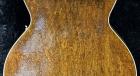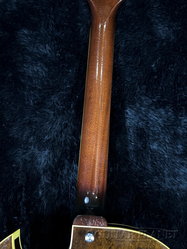 アンプに通した時のトーン、音量を第一に考えてデザインし、フルアコースティック構造ながらもサウンドの芯とサスティーンを得る為にブリッジの裏側に当たる位置に15mmの分厚いスプルース材「Detroit One Block」(幅80mm長さ70㎜)が施されております。これにより通常のフルアコでは得る事の出来ない独特なサスティーンと良い意味でのコンプ感を伴うサウンドの腰の強さが増し、クランチに歪ませた設定でも十分に対応可能です。