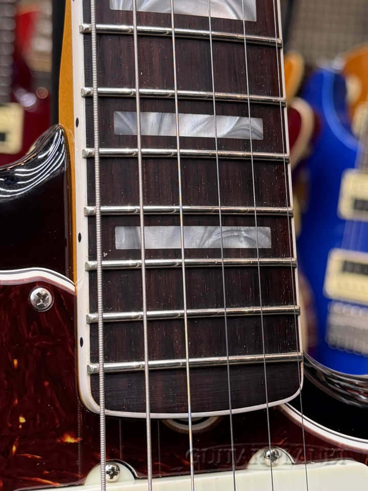 定番のサンバースト・フィニッシュに濃いめの色合いのべっ甲柄ピックガードが格好良く、比較的軽量な個体です。